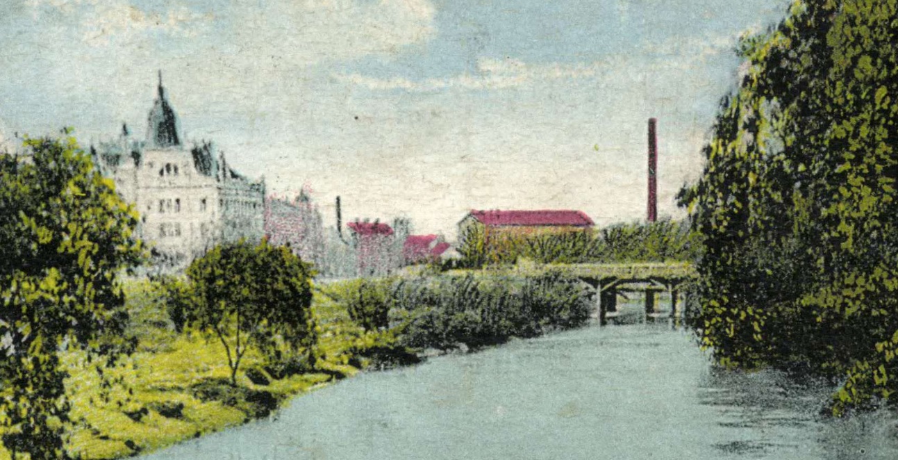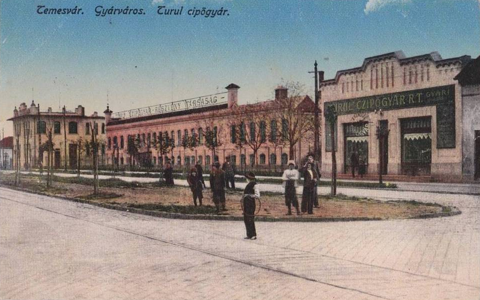 Traseul Liniei II pe lângă fabrica de încălțăminte este, de asemenea, cu bandă dublă din 1915, aici cu o bandă verde în mijloc.