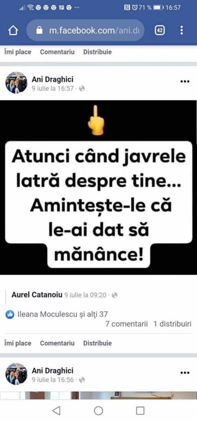 Ani Drăghici, inspector pentru programe comunitare şi integrare europeană în cadrul Inspectoratului Şcolar Dolj, a postat recent pe pagina sa de socializare următorul mesaj: „Atunci când javrele latră despre tine… Aminteşte-le că le-ai dat să mănânce“. Mesajul a fost însoţit şi de un semn obscen: o mână cu degetul mijlociu ridicat.