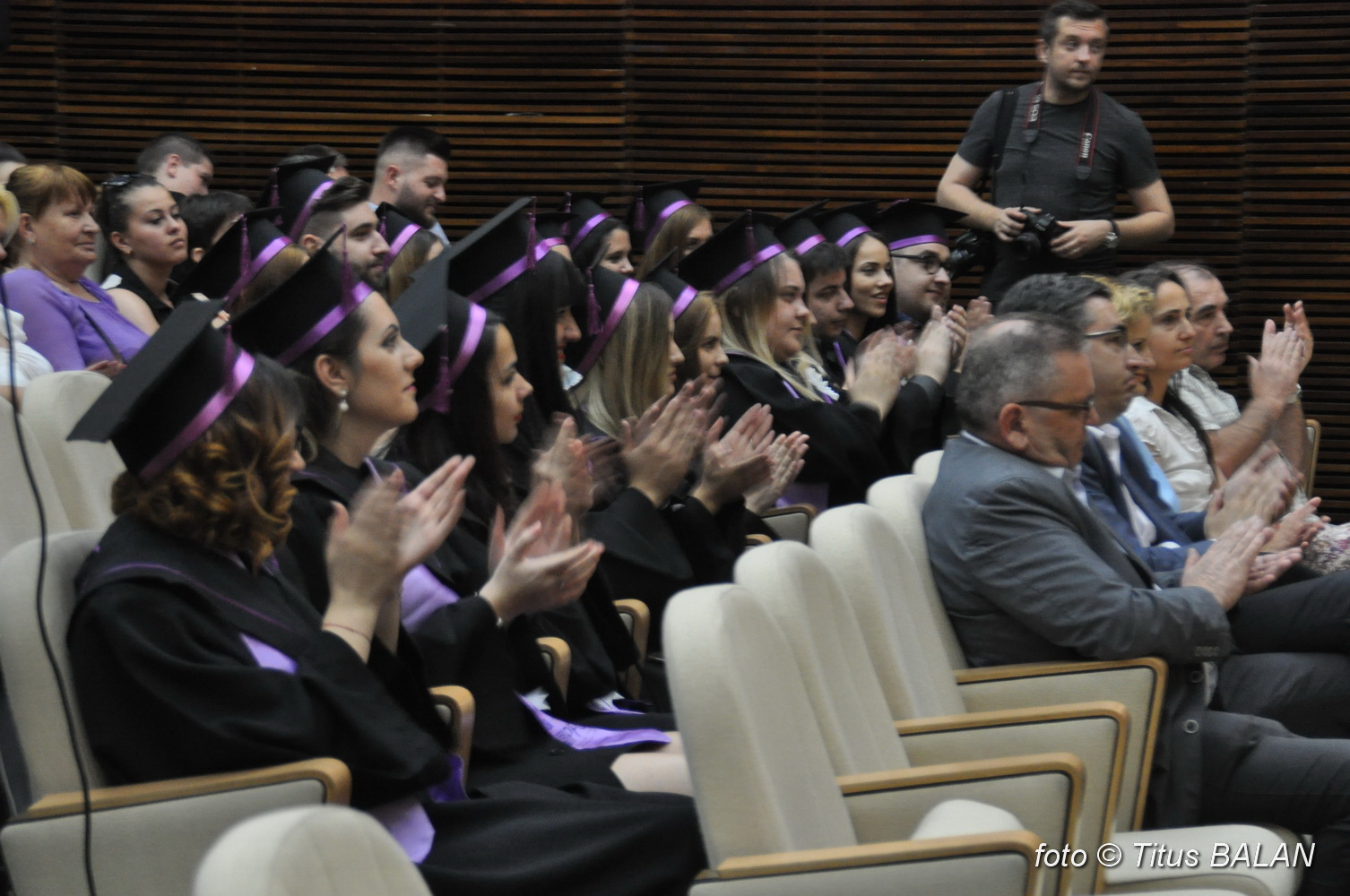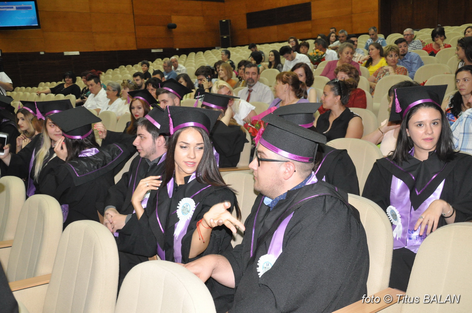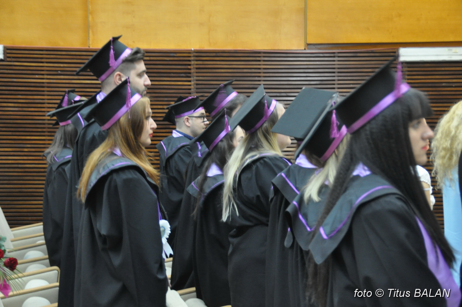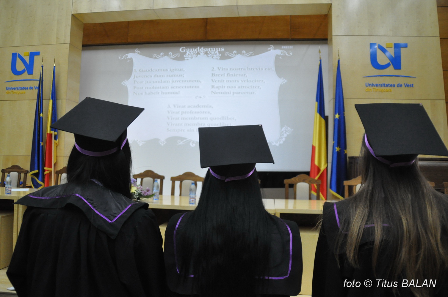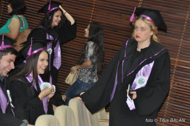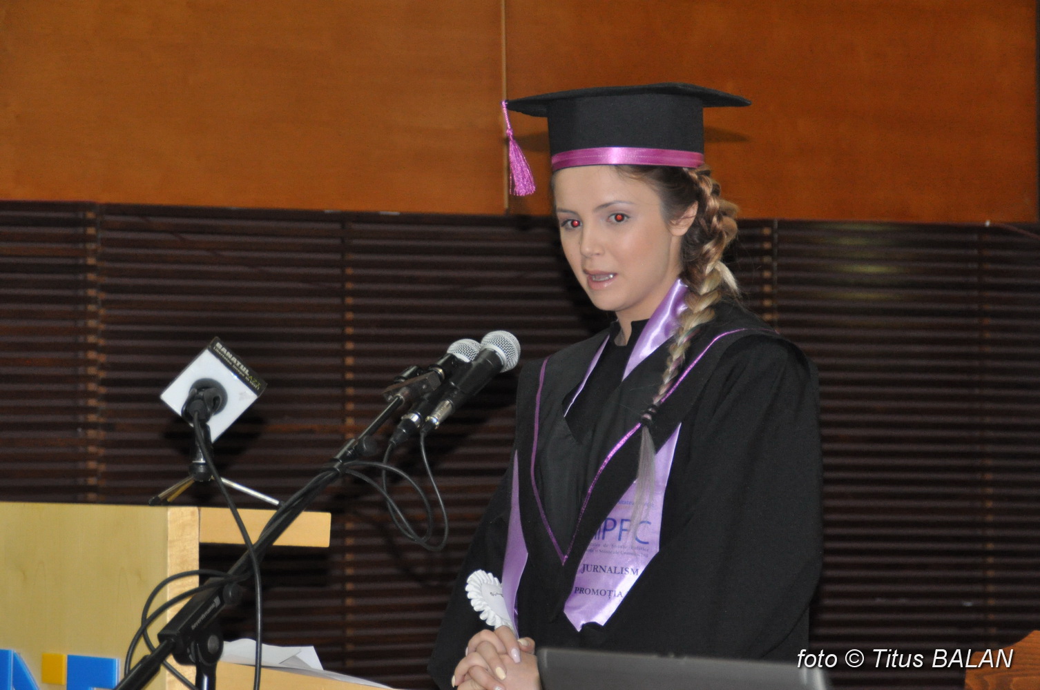 În Aula Magna a Universității a răsunat binecunoscutul imn academic „Gaudeamus igitur” care îndeamnă la bucurie. A fost bucuria de a trece o ultimă etapă din perioada de formare și de a se recomanda de acum înainte ca tineri specialiști în domeniile pe care le vor aborda. Flori, zâmbete, glume, mulțumiri către părinți și dascăli, toate și-au avut locul în festivitatea lor entuziastă. Nu a lipsit nici multitudinea de fotografii făcute cu tot soiul de gadgeturi ce le stăpânesc ca unii ce se vor ocupa de mass media.