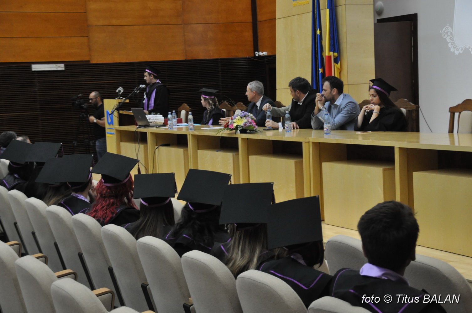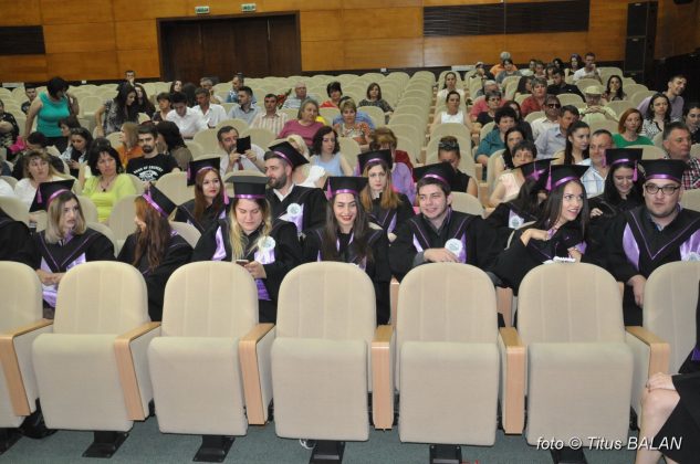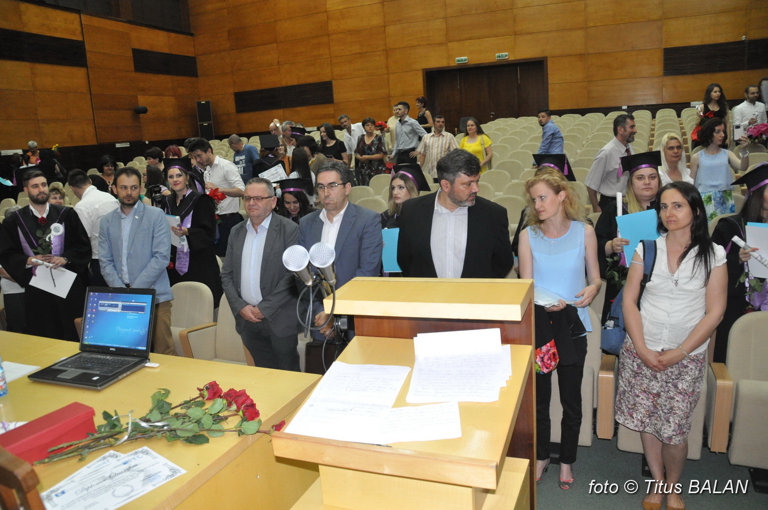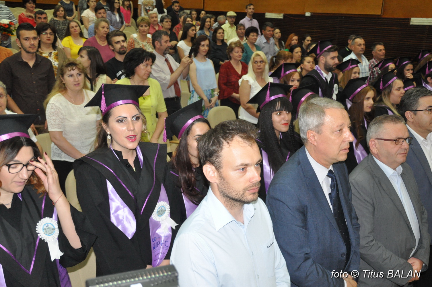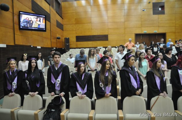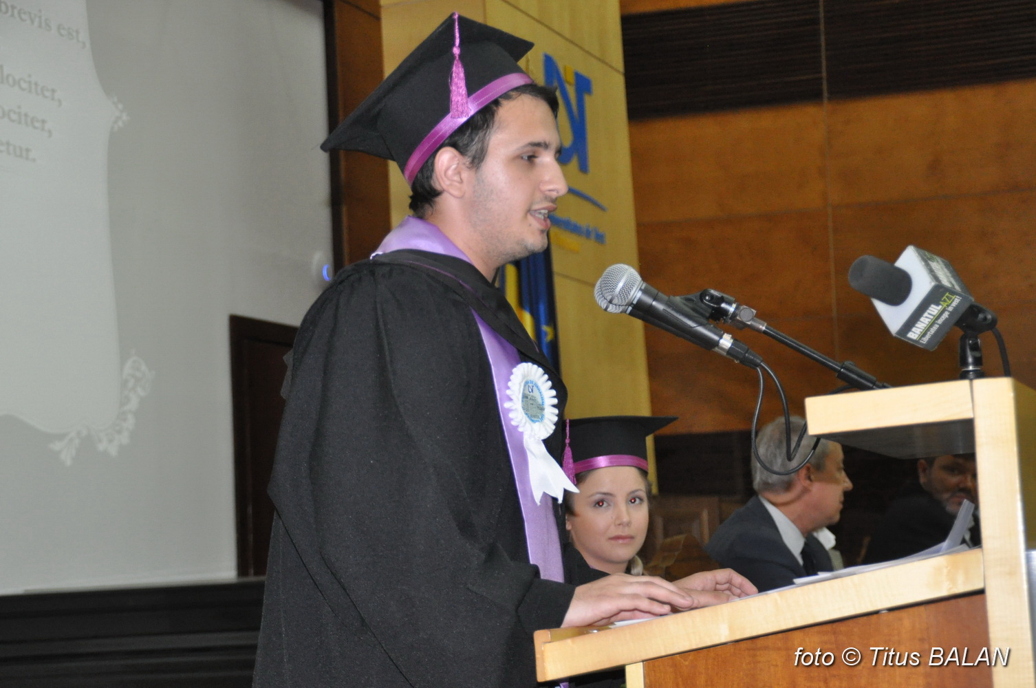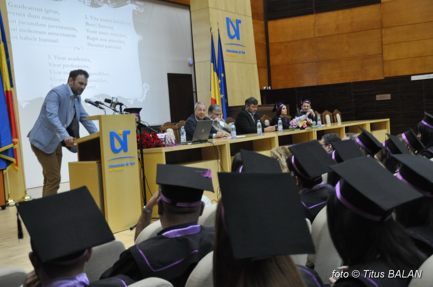 În Aula Magna a Universității a răsunat binecunoscutul imn academic „Gaudeamus igitur” care îndeamnă la bucurie. A fost bucuria de a trece o ultimă etapă din perioada de formare și de a se recomanda de acum înainte ca tineri specialiști în domeniile pe care le vor aborda. Flori, zâmbete, glume, mulțumiri către părinți și dascăli, toate și-au avut locul în festivitatea lor entuziastă. Nu a lipsit nici multitudinea de fotografii făcute cu tot soiul de gadgeturi ce le stăpânesc ca unii ce se vor ocupa de mass media.