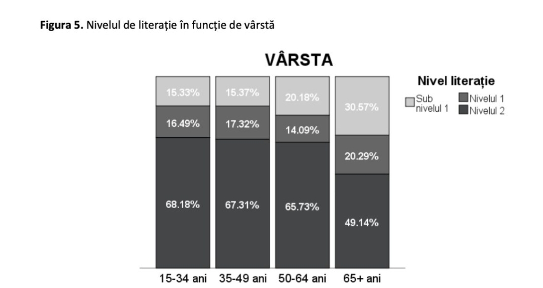 În cazul Literației, ponderea aflată la nivelul cel mai ridicat de competențe – Nivelul 2 – este similară pentru toate categoriile de vârstă, între 15 și 64 de ani, cu o scădere ușoară odată cu înaintarea în vârstă, dar scade brusc în cazul populației de peste 65 de ani. Astfel, dacă ponderea celor de Nivel 2 este de 68,18% pentru cei tinerii de 15-34 de ani și scade ușor la 65,73% în cazul populației de 50-64 de ani, scăderea este abruptă, până sub pragul de 50% (49,14%) în cazul populației de 65+ ani.