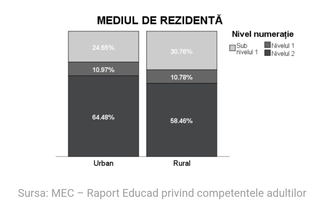 În cazul Numerației (competanța de calcul), situația este considerabil mai gravă în ceea ce privește adulții sub Nivel 1: 27,5% sunt în această zonă a analfabetismului funcțional. La Nivel 1, de risc, se află 10,9%. Iar la Nivel 2, 61,6% – aproape la fel de mult ca în cazul Literației.