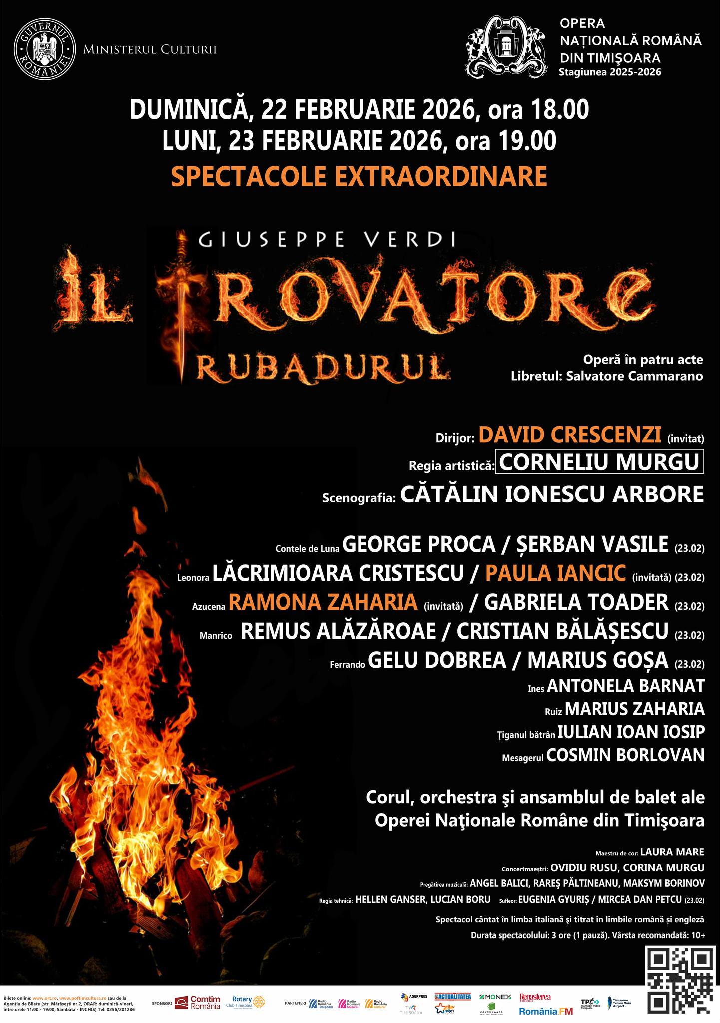 • Spectacolul din 22 februarie o are în prim-plan pe mezzosoprana Ramona Zaharia (Deutsche Oper am Rhein – Düsseldorf), care va debuta pe scena timișoreană în rolul Azucenei. Distribuția din 22 februarie 2026: George Proca (Contele de Luna), Lăcrimioara Cristescu (Leonora), Ramona Zaharia (Azucena),
