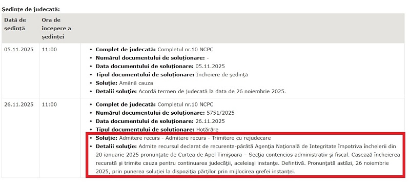 Pe 26 noiembrie 2025, într-o mișcare suprinzătoare, ÎCCJ admite recursul ANI. Casează încheierea de suspendare a Curții de Apel Timișoara și dispune reluarea judecării dosarului. Hotărârea este definitivă și comunicată părților prin intermediul grefei instanței.