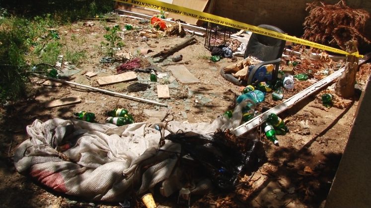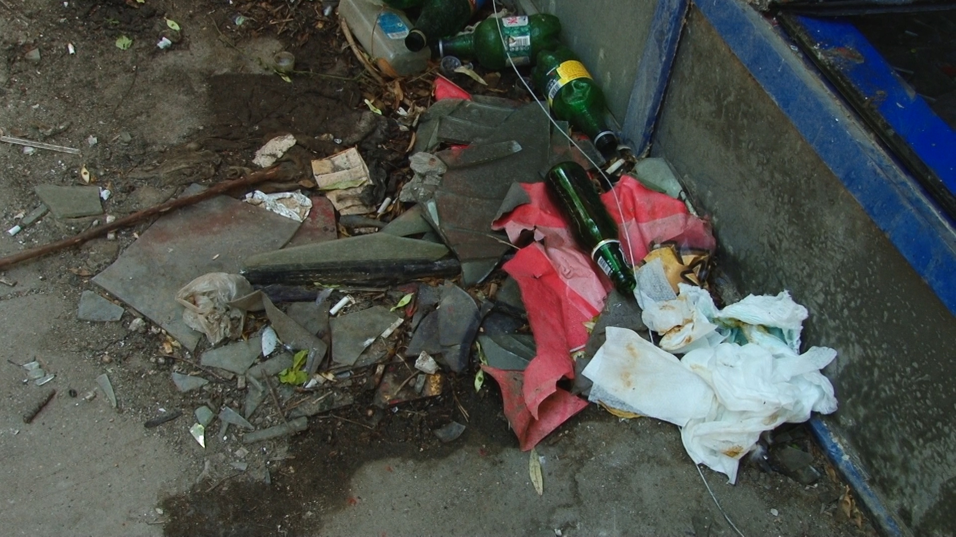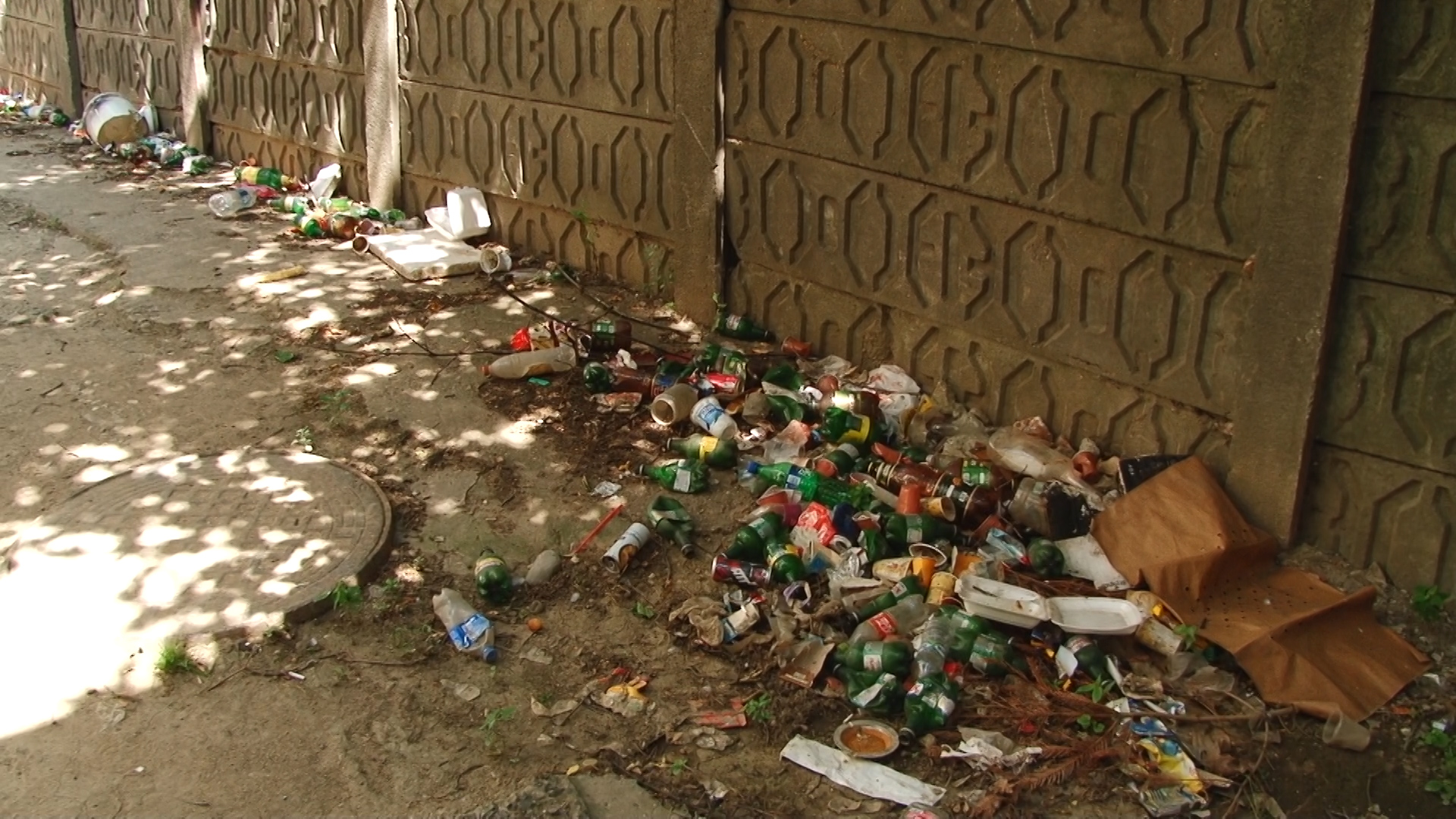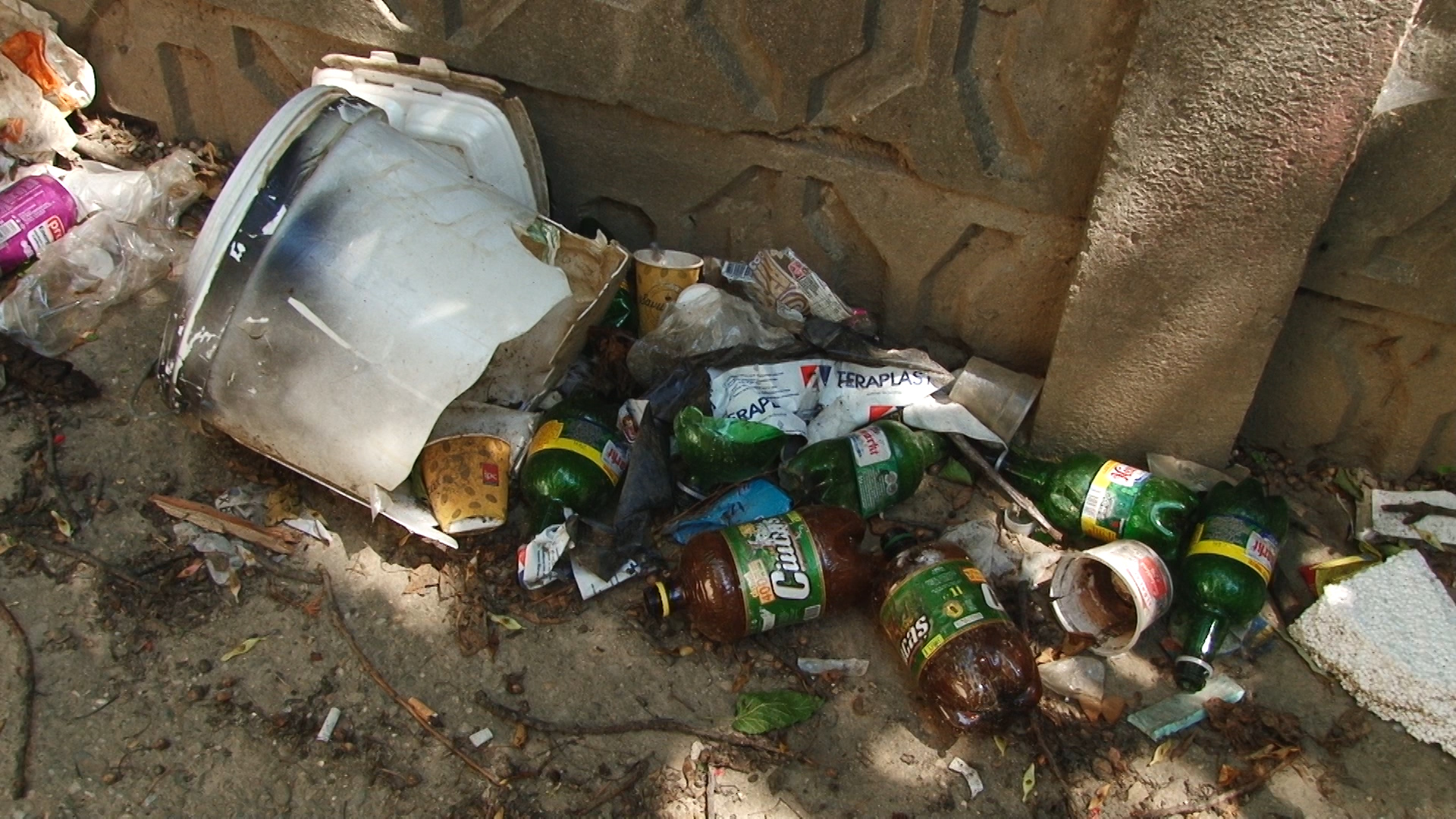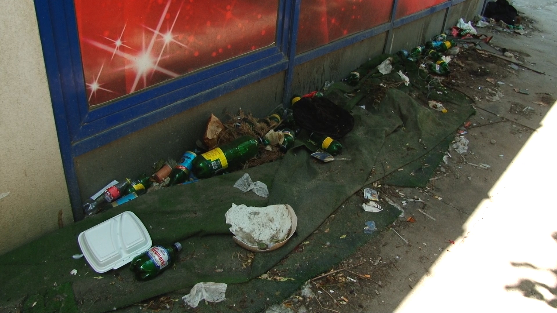 Aici sunt peturi de bere golite parțial și cu restul rânced în fermentație. Tot de la bere sunt și dozele de aluminiu aruncate vraiște. Resturi alimentare, șobolani morți stau alături de dejecții umane și animale. Semn că oricine își face nevoile aici mai ceva ca în pădure.