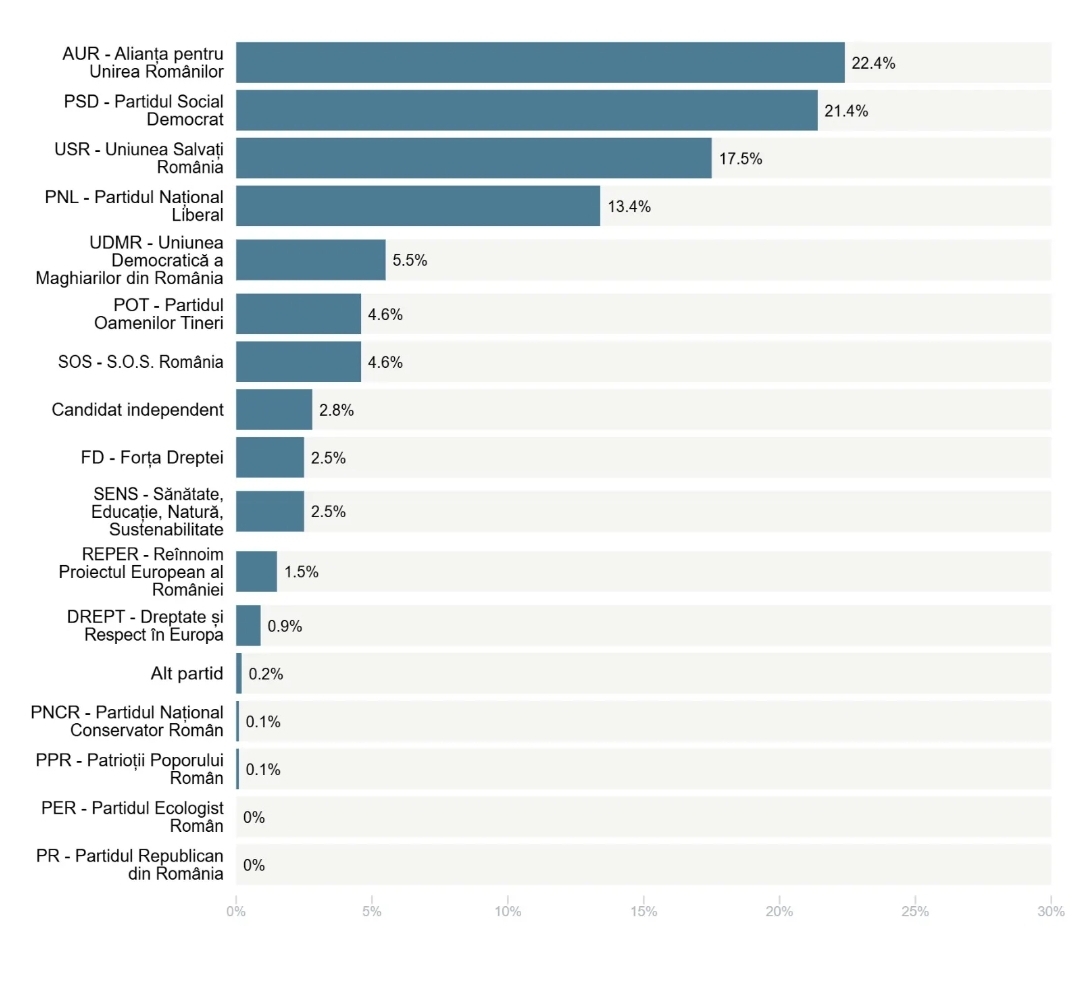 Potrivit cercetării, partidul condus de George Simion este creditat cu 22.4% din voturile românilor, urmat la un procent de PSD – cu 21.4% și de USR – cu 17.5%.