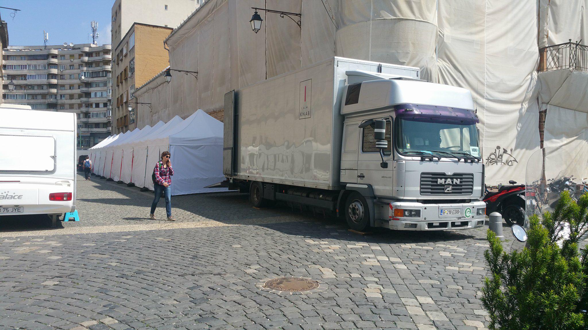 Unul dintre TIR-uri a intrat, vineri, chiar în Piaţa Unirii. Greu de crezut că sub greutatea lui nu va crăpa piatra cubică adusă special pentru reabilitarea zonei istoice a oraşului.