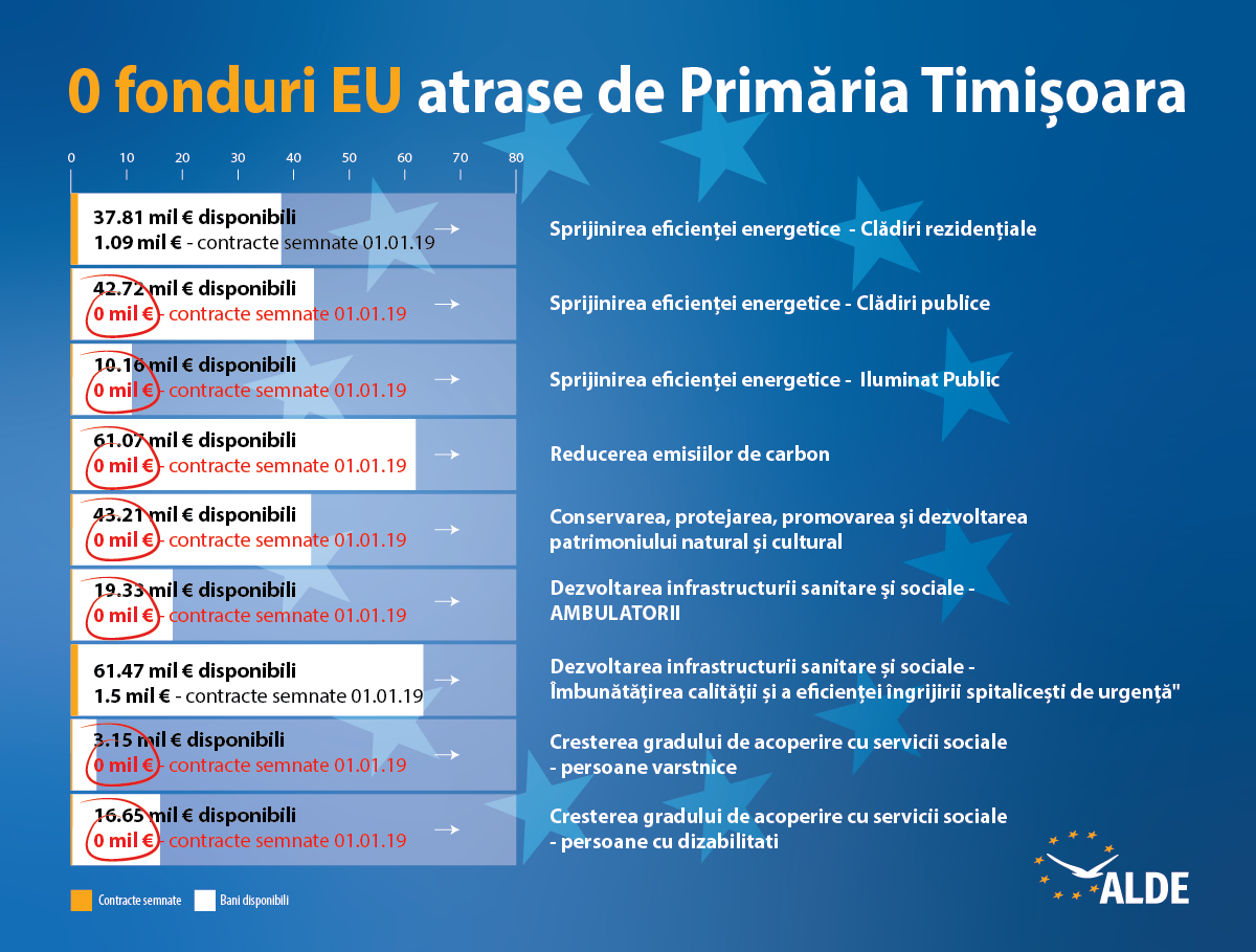 Mai jos ALDE Timiș arată (vezi tabelul din ataşament) câte fonduri europene a pierdut Timişoara în perioada 2016-2018 din cauza neglijenţei, indolenţei şi managementul defectuos al Primăriei Timişoara”