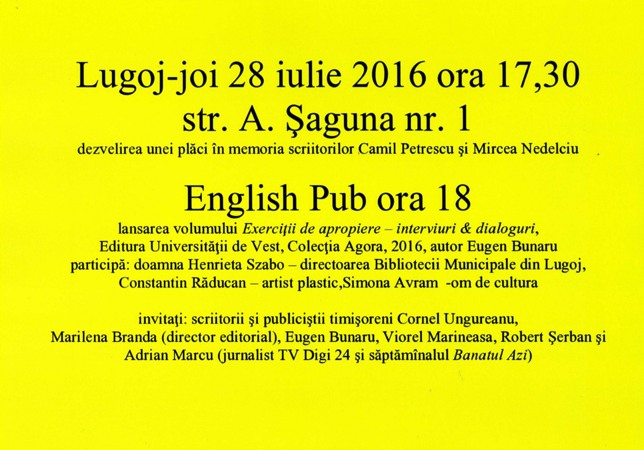 Dezvelirea unei plăci în memoria lui Camil Petrescu şi Mircea Nedelciu şi lansarea volumului Exerciţii de apropiere – interviuri&dialoguri vor avea loc joi, 28 iulie, de la ora 17:30 la Lugoj.