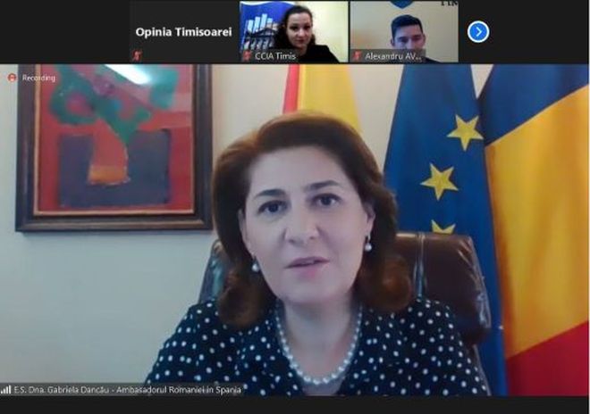 „Am gândit acest webinar ca un preambul la ceea ce ne pregătim să organizăm în luna octombrie, un forum economic în Spania, la Sevilla. Sper ca prezentările să aducă informațiile utile cu privire la potențialul pe care îl are Spania pentru afacerile agenților economici din Timiș. Aș vrea să fac referire la trei elemente cheie în decizia de a vă internaționaliza afacerile în Spania. Nu există bariere comerciale și legislative, iar cea mai importantă barieră – limba poate fi depășită. Peste 1 milion de români sunt stabiliți în Spania. O parte a diasporei române s-a îndreptat spre antreprenoriat și aveți posibilitatea să faceți parteneriate cu ei. (….) Spania poate fi folosită ca platformă pentru piețele sud-americane și nord-africane. Încurajez antreprenorii români să ia în calcul și posibilitatea de a investi în Spania, țară care oferă companiilor rezidente beneficii”, a spus E.S. Gabriela Dancău, ambasadorul României în Regatul Spaniei.