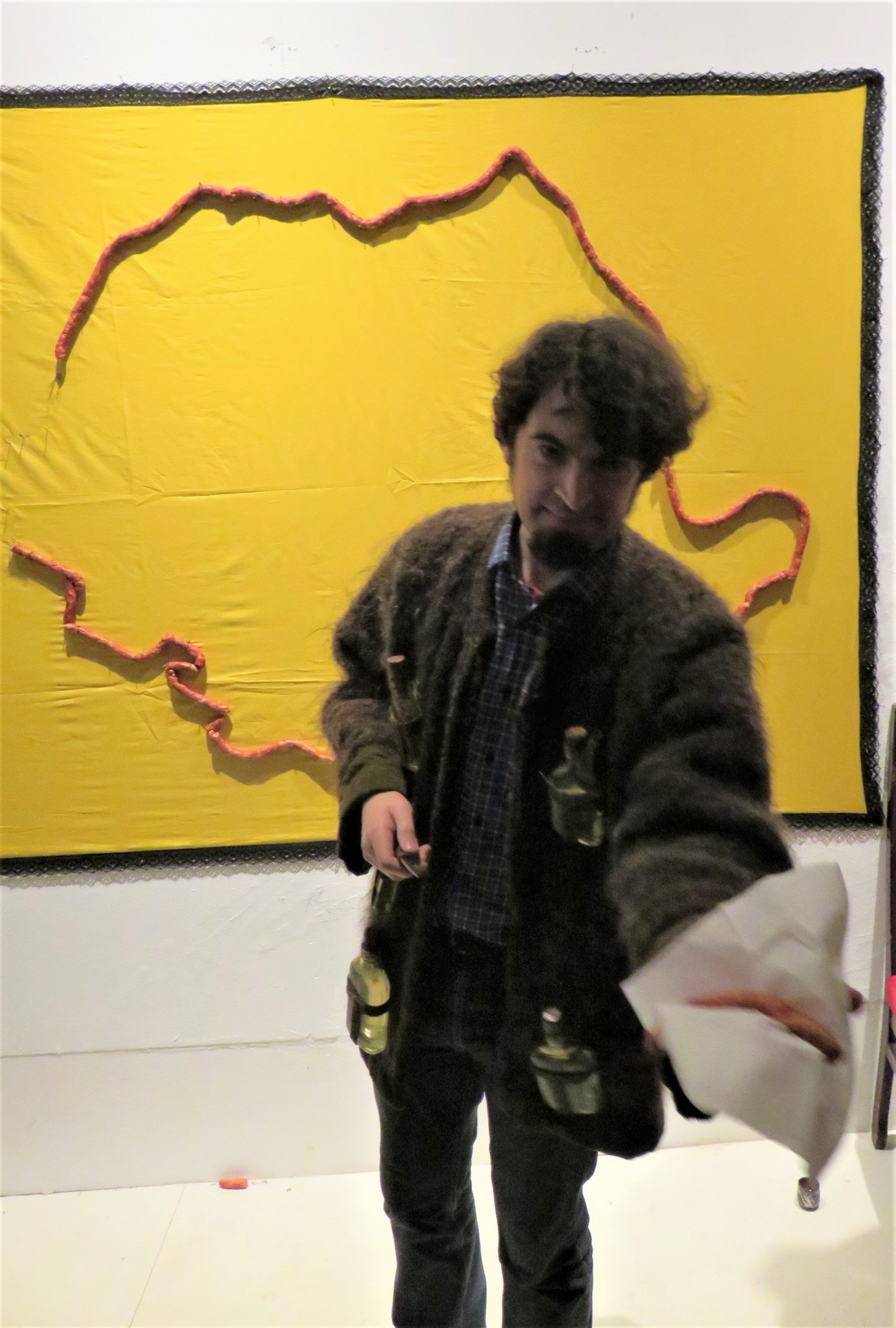 Unul dintre momentele aparte ale seriei de evenimente i-a aparţinut artistului Saşa-Liviu Stoianovici care, în Galeria KUB, a imaginat o hartă a României din… cârnaţi. Iar participanţii la recitalul de poezie ce a avut loc acolo, nu doar că au admirat conturul ţării noastre, dar l-au şi mâncat, căci Stoianovici a tăiat câte-o bucăţică pentru toţi doritorii şi pofticioşii.
