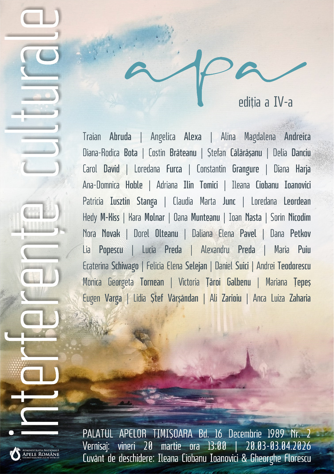 Apa este început și memorie, forță și fragilitate, graniță și legătură. În cea de-a patra ediție a expoziției colective Apa – Interferențe culturale, artiștii invitați propun o reflecție vizuală asupra apei ca element primordial și ca spațiu de întâlnire între culturi și limbaje artistice. Găzduită de Palatul Apelor din Timișoara, loc emblematic dedicat gestionării și înțelegerii acestei resurse vitale, expoziția creează un dialog subtil între patrimoniul arhitectural și expresiile contemporane ale artei vizuale. Apa devine aici nu doar temă, ci mediu simbolic: curgere a timpului, oglindă a identității, teritoriu al memoriei colective.
