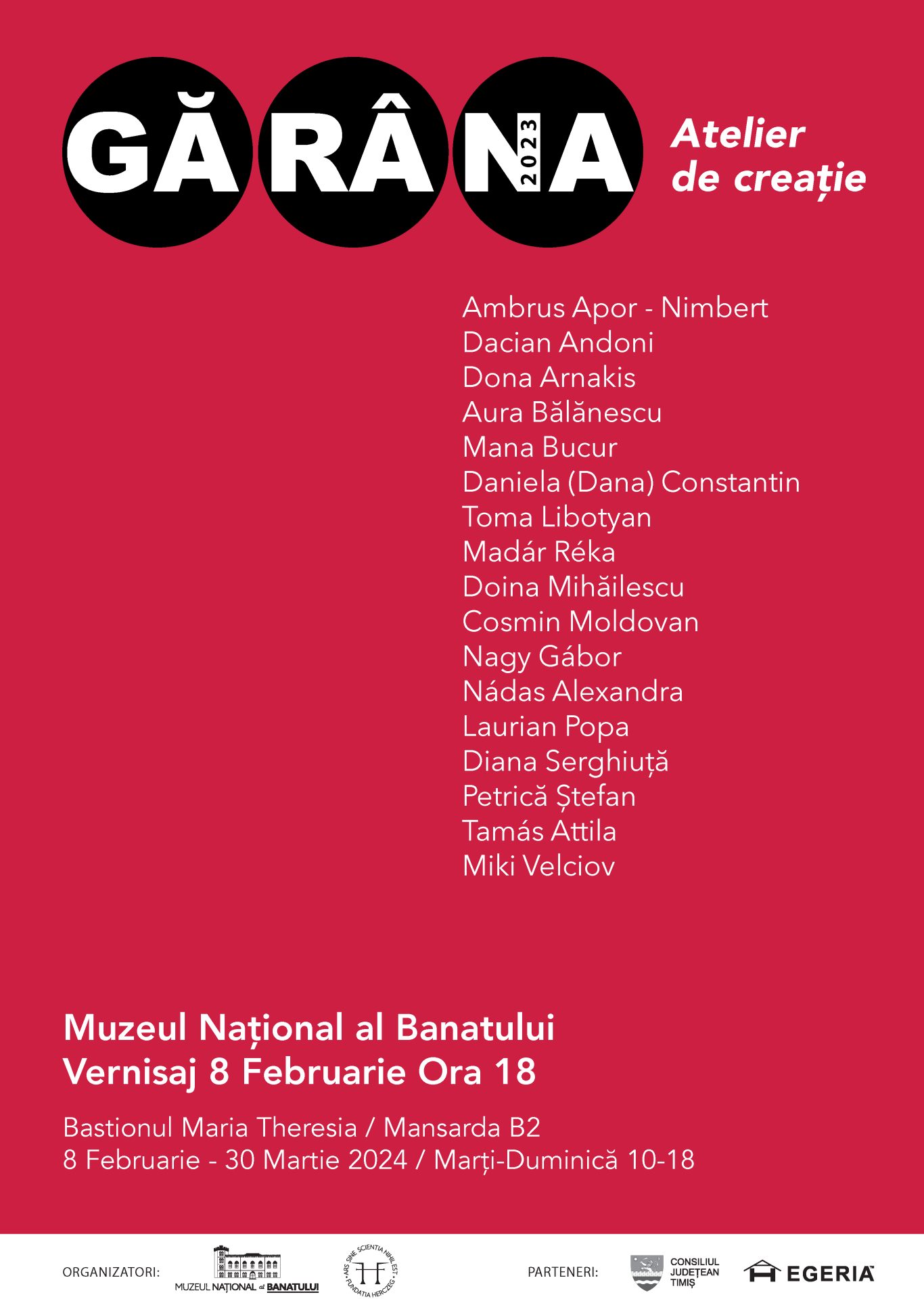 Muzeul Național al Banatului în colaborare cu Fundația Herczeg și cu sprijinul Consiliului Județean Timiș și al Egeria vă invită să admirați pe simezele Bastionului Theresia din Timișoara, rezultatul celei de-a XIII-a ediții a Simpozionului de Artă Contemporană Gărâna 2023.