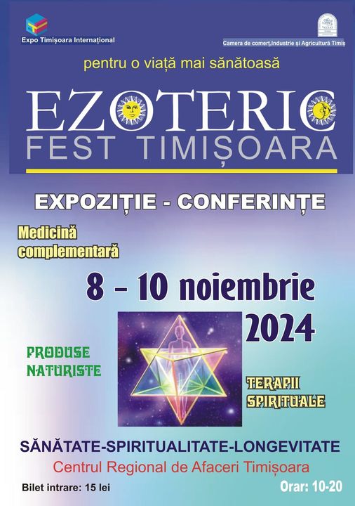 Expo Timișoara Internațional în parteneriat cu Camera de Comerț, Industrie si Agricultură Timiș readuc în atenția publicului cea de-a 29-a ediție a EZOTERIC FEST, care se va desfășura în perioada 8-10 noiembrie 2024, la Centrul Regional de Afaceri al CCIA Timiș, un festival pentru o minte liniștită, un suflet și un corp plin de energie, parte din mai larga tematică Timișoara Terapeutică.