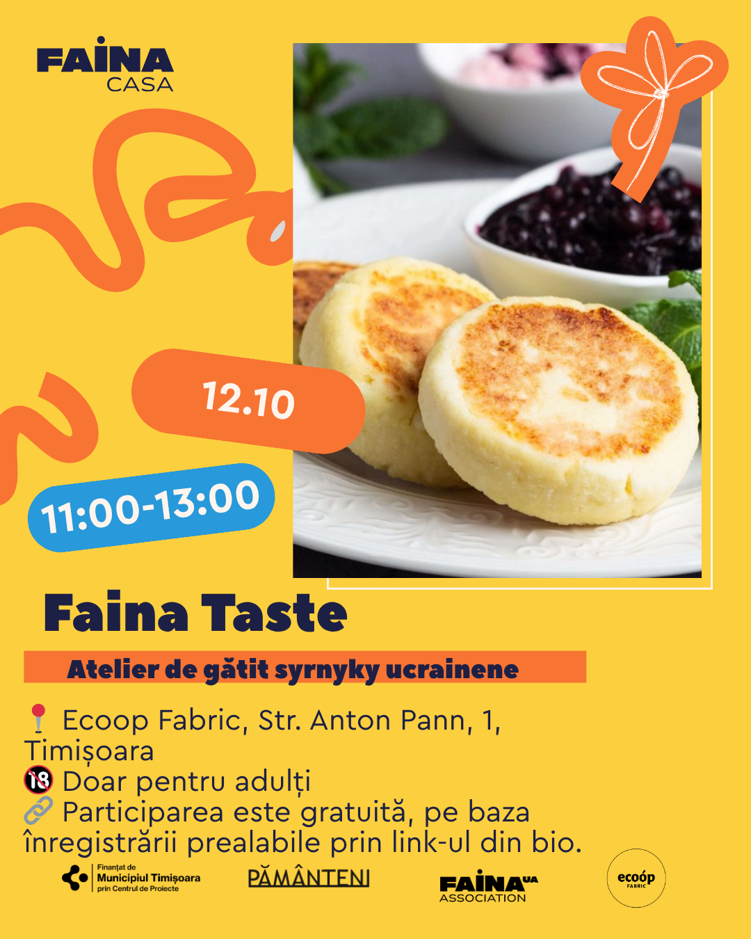 Faina Casa revine cu atelierele de gătit în cadrul secțiunii Faina Taste. Primul dintre acestea va avea loc duminica, în 12 octombrie, de la 11:00 la 13:00, la Ecoop Fabric (Str. Anton Pann nr. 1) și va fi un atelier de gătit «syrnyky» ucrainene. Doisprezece participanți, împreună cu Iryna Chykaliuk vor învăța să pregătească adevărații «syrnyky» ucraineni (de la frământarea aluatului până la crusta aurie în tigaie). Lecția de gătit se va încheia cu o degustare a delicioșilor syrnyky cu smântână. Atelierul se adresează doar adulților, iar participarea este gratuită, pe bază de înscriere prealabilă prin link-ul: