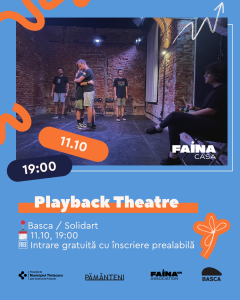 La sediul Teatrului Basca,va avea loc în 11 octombrie, de la ora 19:00, Playback Theatre, ”Întrebări și răspunsuri în oglindă”. Este vorba despre teatru de improvizație, un exercițiu teatral în care unde comunitățile ucraineană și română