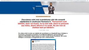 Strategia înșelătoriei pornește de la stimularea emoțiilor și a indignării publice. Este creată o pagină care simulează o ediție a talk-show-ului România9, pentru a lansa o minciună sfruntată sub titlul strident Discutarea celei mai scandaloase știri din această săptămână în studioului România9: „Pensionarii sunt bătrânii, lasă-i să moară, nu le este milă. Dacă nu presiune sau inima, atunci altceva îi va ucide. Nu are rost să cheltuie bani pe bătrâni!”