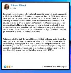Afirmația, cu multe scăpări ortografice, este atribuită unei anume Mihaela Bălănoiu, „farmacist șef adjunct al României”. Pentru un plus de credibilitate, este prezentată o prezumtivă captură de ecran de pe pagina acesteia, unde se poate citi că doamna nu ar fi de acord cu vânzarea la preț scăzut a unui medicament extraordinar, care ar putea fi comercializat de zece ori mai scump. „Voi merge până la vârf, dar nu voi lăsa acești idioți să dea un astfel de medicament pe gratis…”, scrie pe pagina invocată, care ar fi fost deja ștearsă de pe Facebook.