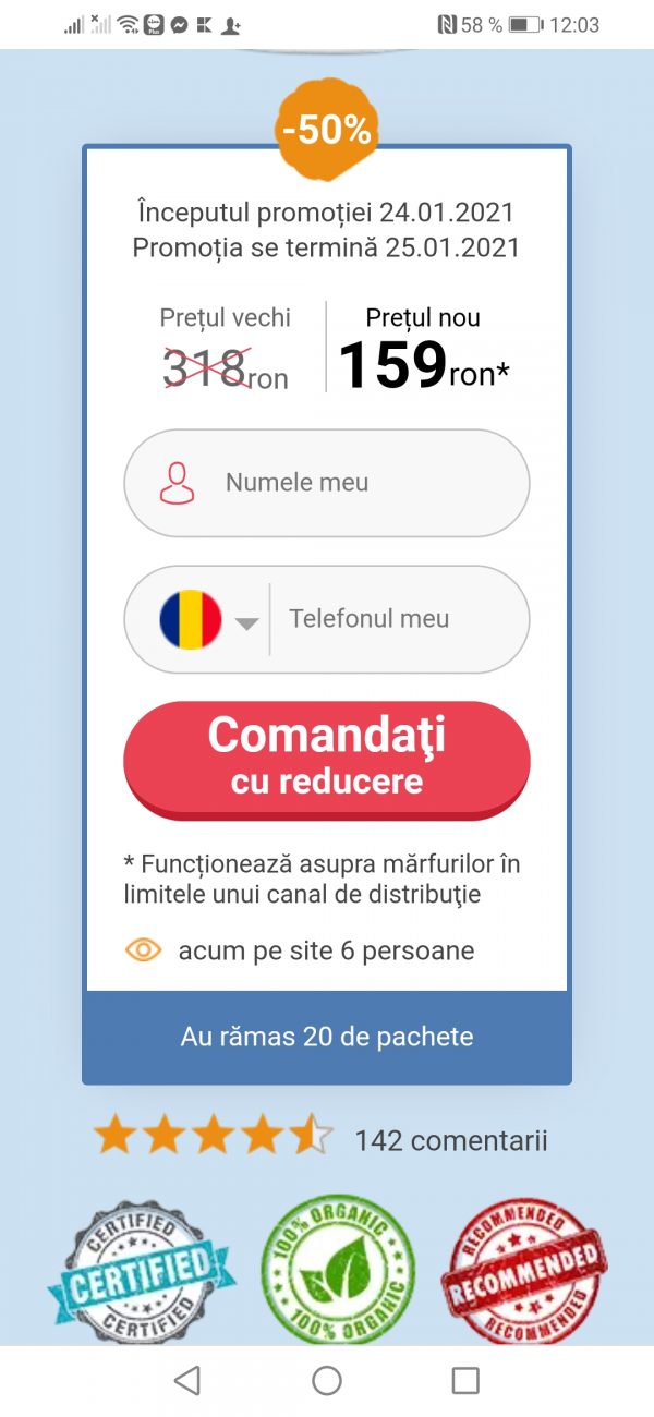Cine s-a lăsat convins a fost invitat să completeze pe site-ul reclamei numele și un număr de telefon. Am făcut-o și eu. În câteva minute am primit un apel de pe un număr cu prefixul 0364, corespunzător zonei Cluj. La telefon, o doamnă cu puternic accent moldovenesc are câteva întrebări: pentru cine este medicamentul, ce vârstă are, ce boli. Apoi pune punctul pe „i”: nu se poate cumpăra o cutie cu prețul preferențial de 159 lei, trebuie minimum 4 cutii a câte 10 pastile la 596 lei, iar ideal este 8 cutii cu prețul excepțional de 790 lei.