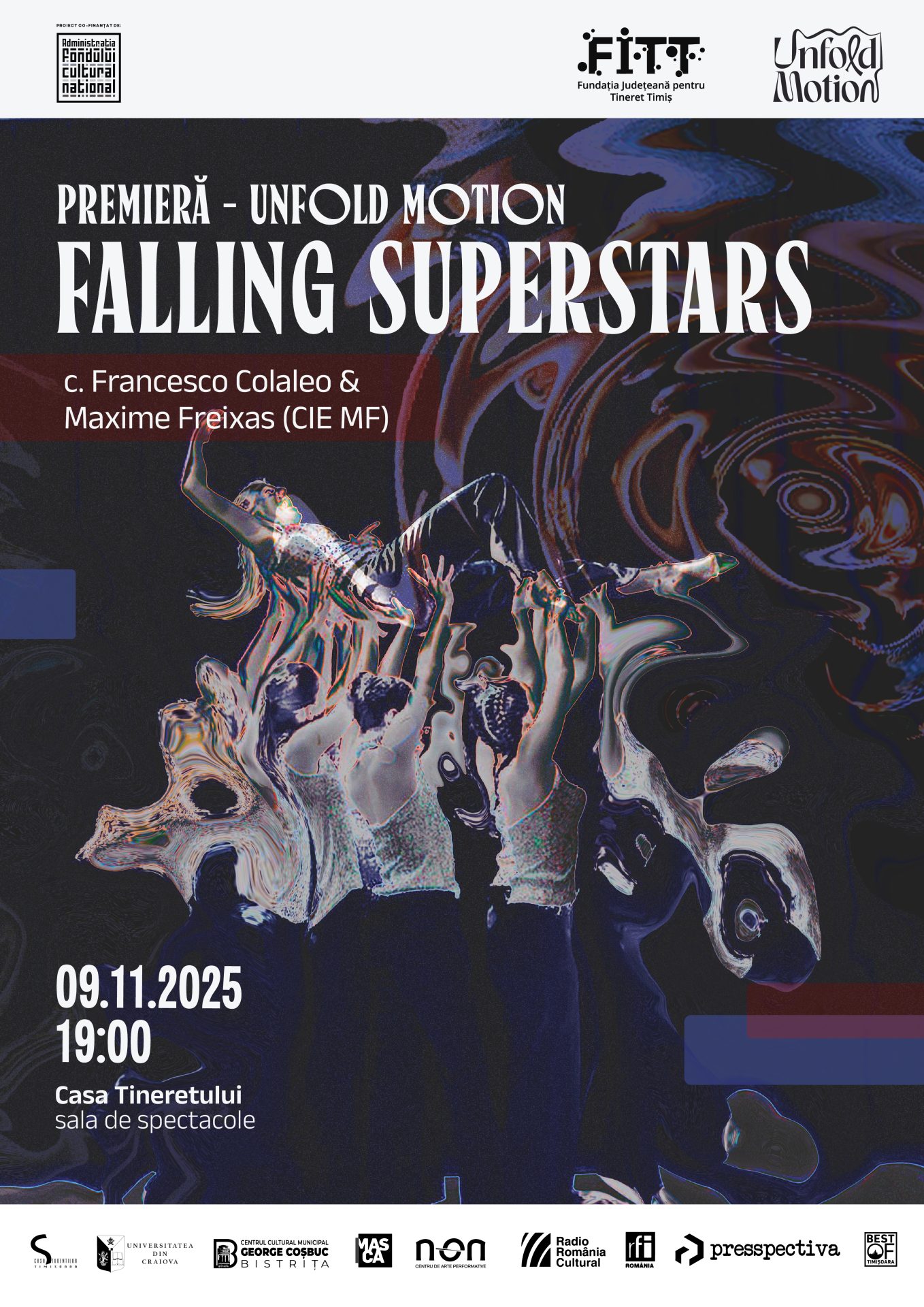 Pe data de 9 noiembrie, publicul timișorean este invitat la Casa Tineretului (sala de spectacole), de la ora 19.00, pentru a asista la premiera spectacolului Falling Superstars- semnat de coregrafii companiei de dans MF din Franța- Maxime Freixas & Francesco Colaleo.