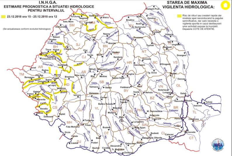 Conform Institutului Naţional de Hidrologie şi Gospodărire a Apelor (INHGA), până la ora 00:00, se vor produce scurgeri importante pe versanţi, torenţi, pâraie, viituri rapide şi creşteri rapide de debite şi niveluri, cu posibile depăşiri ale Cotelor de inundaţie, pe râurile din bazinul hidrografic Bistra (judeţul Caraş-Severin).