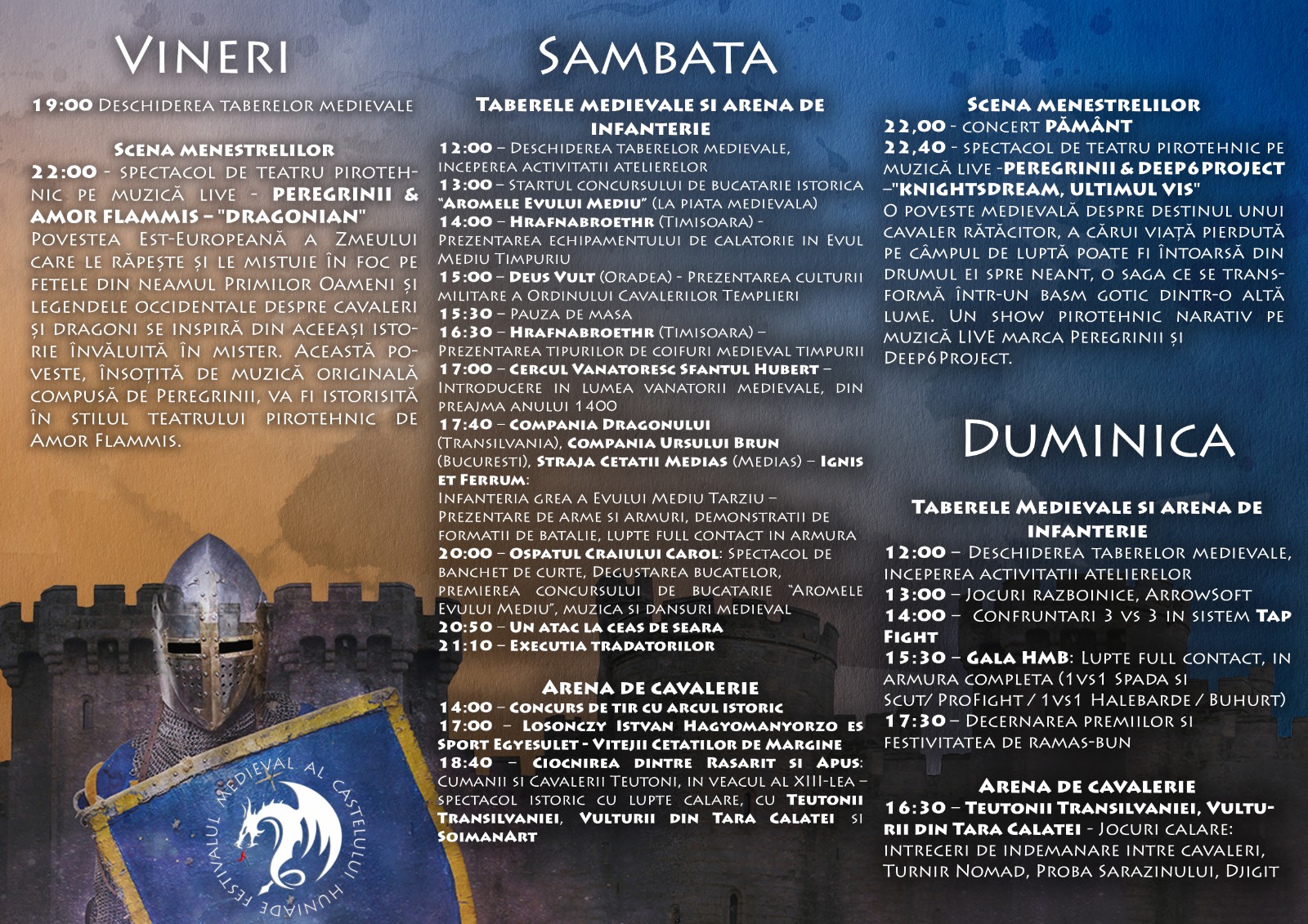 Participanți: grupurile de reconstituire istorică Hrafnabroethr, Compania Dragonului, Compania Ursului Brun, ȘoimanArt, Cercul Vânătoresc „Sf. Hubert”, Amor Flammis, Deus Vult, Straja Cetății Mediaș, Asociația Losonczy Istvan, Teutonii Transilvaniei, Vulturii din Țara Calatei și grupurile artistice Peregrinii, Deep6 Project.