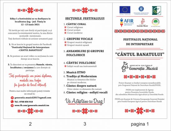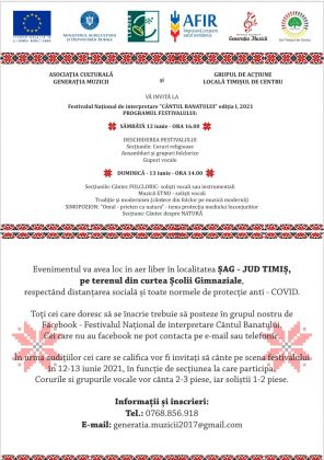 În perioada 12-13 iunie 2021 va avea loc în comuna Șag, Festivalul național de interpretare „Cântul Banatului”, evenimentul ce se va desfăsura în curtea școlii din localitatea Șag pe parcursul a 2 zile.