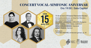 Orchestra simfonică și Corul Ion Românu ale Filarmonicii Banatul vor susține vineri, 15 aprilie, de la ora 19, concertul vocal-simfonic cu ocazia celor 75 de ani de la înființarea Filarmonicii Banatul.
