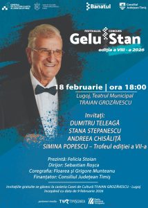 Finaliștii Festivalului – Concurs „Gelu Stan”, ediția a VIII-a, vor evolua în cadrul concursului, al festivității de premiere și al spectacolului de gală, care se vor desfășura în data de 18 februarie 2026, la Teatrul „Traian Grozăvescu” din Lugoj. Invitați speciali în spectacolul de gală vor fi renumiții soliști Dumitru Teleagă, Stana Stepănescu, Andreea Chisăliță și Simina Popescu, laureata Trofeului ediției a VII-a a festivalului-concurs.