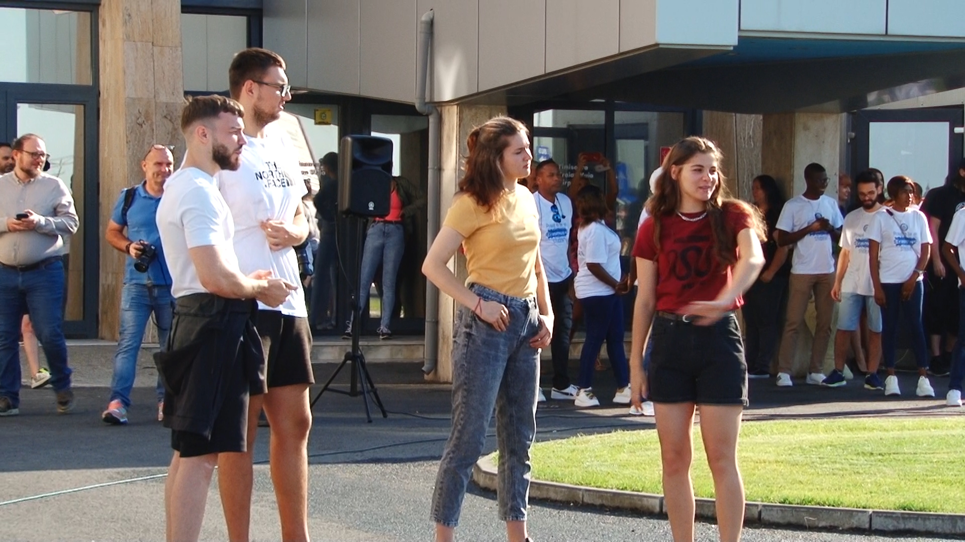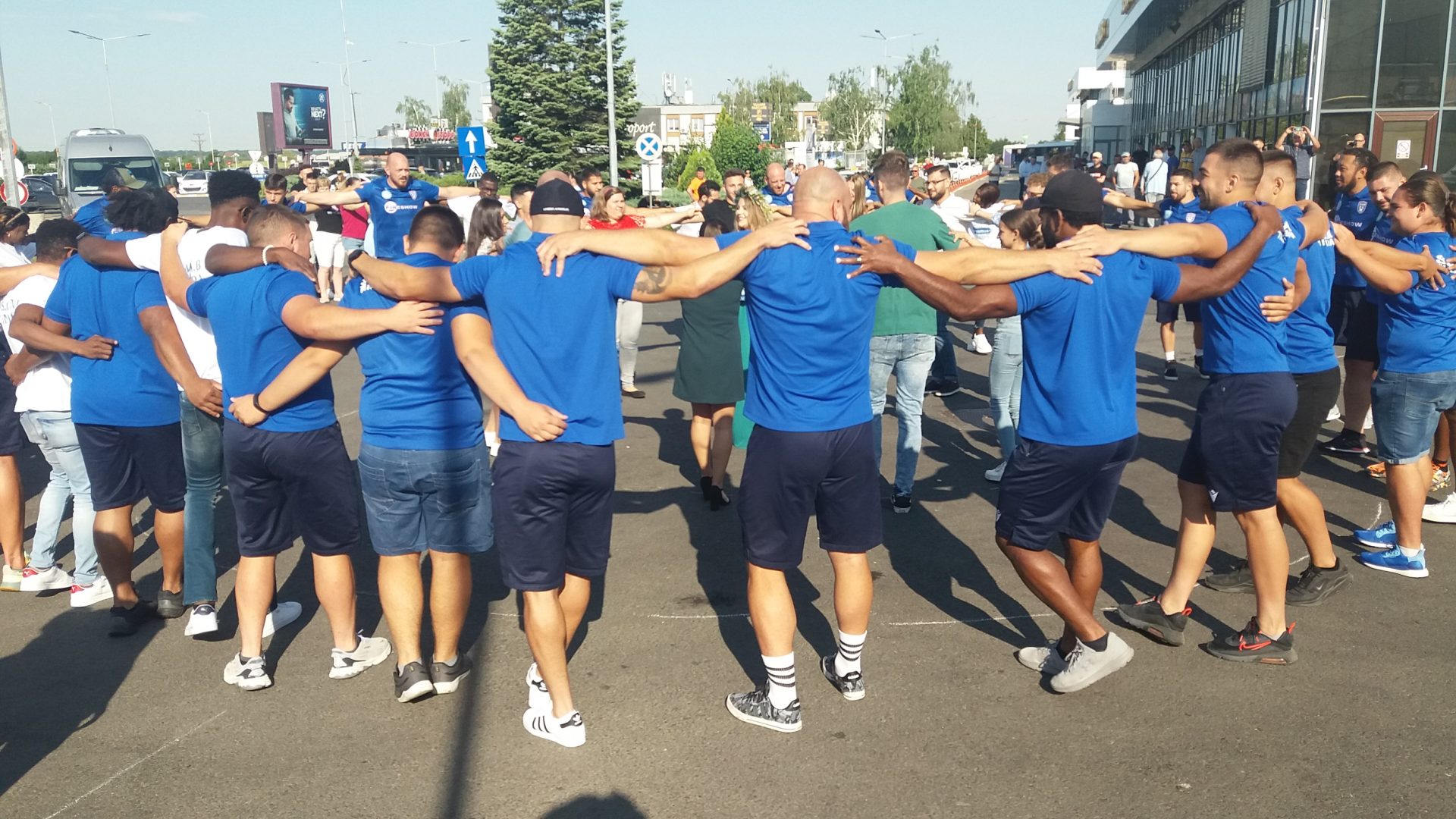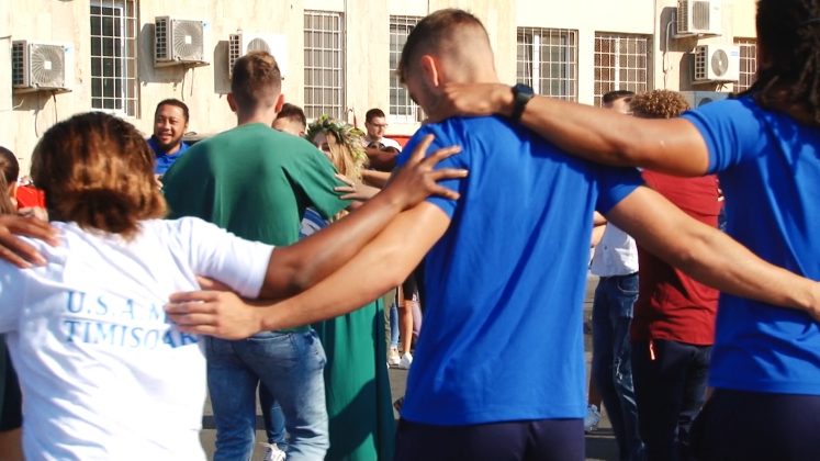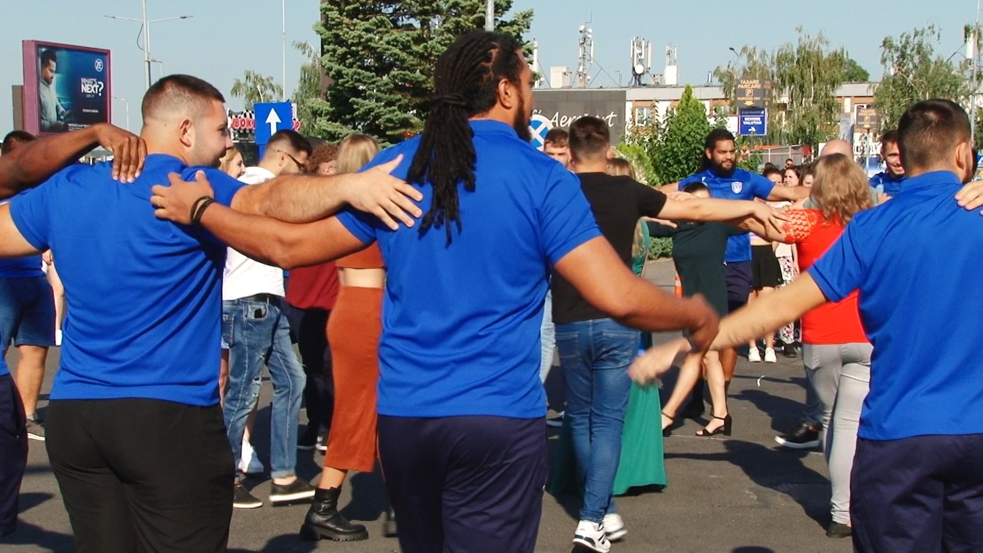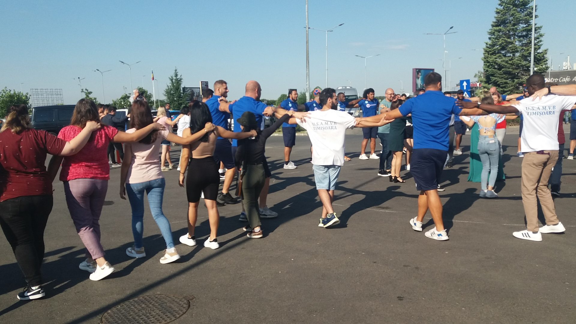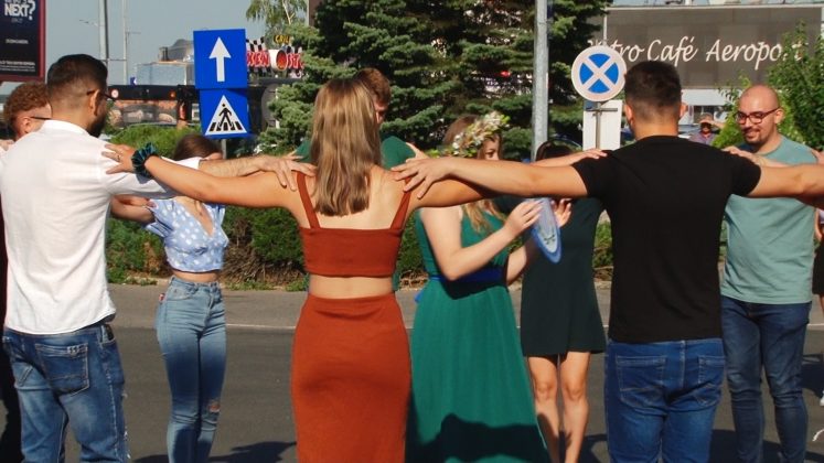 Misterul nu avea să dureze prea mult. La un moment dat a apărut profesorul Cosmin Popescu, rectorul USAMVB însoțit de o adevărată legendă a muzicii românești, Ovidiu Lipan Țăndărică în compania lui Dan Borzaș managerul echipei de rugby. Toți tinerii aveau să se prindă într-un cerc ce părea o incantație vizuală pentru armonie și sport. La cercul inițial ce creștea cu noi straturi concentrice aveau să se alături câteva grupuri ce formau razele unui imaginar soare. Pasagerii din apropiere, la început surprinși, au intrat în jocul studenților și filmau și fotografiau cu frenezie orice mișcare. Flash-mob-ul nu a durat decât câteva minute culminând cu ridicare în aer, ca la o repunere de la margine, la un meci cu balonul oval, a unei domnișoare cu o coroană de frunze ce aminteau de cununile de laur din antichitate.