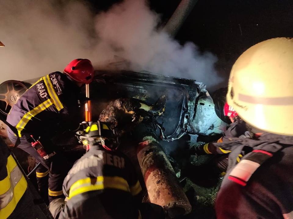 Un autoturism s-a răsturnat și a luat foc. În momentul sosirii celor patru echipaje de intervenție a Detașamentului de Pompieri Arad, echipaj de stingere, descarcerare și două echipaje SMURD, autoturismul ardea generalizat.