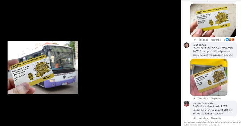 Conturile din comentariile postării atașate au fost deja blocate, din fericire. Totuși putem observa faptul că persona ori programul informatic din spatele acestor conturi false s-a încurcat. La o fotografie cu un card fals de transport în comun din Cluj, în descrierea comentariului era: „Mă simt norocos că am fost printre primii 500 să prind acest card. RATT a făcut o treabă grozavă!”, comentariu care stârnește râsete în rândul internauților.