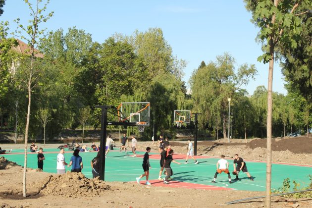 Tinerii au început deja să joace baschet pe noul teren amenajat pe malul Begăi. Aceștia se strâng, alături de prietenii lor, și bat mingea pe terenul din beton, înconjurat de maldăre de pământ.