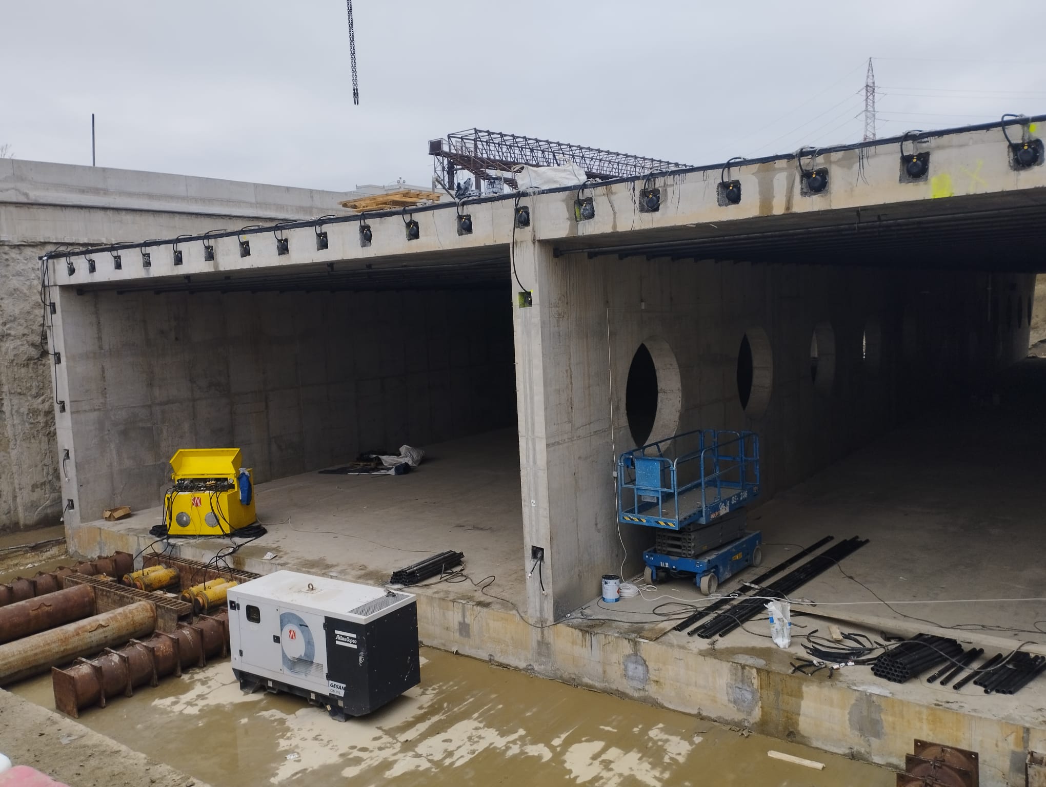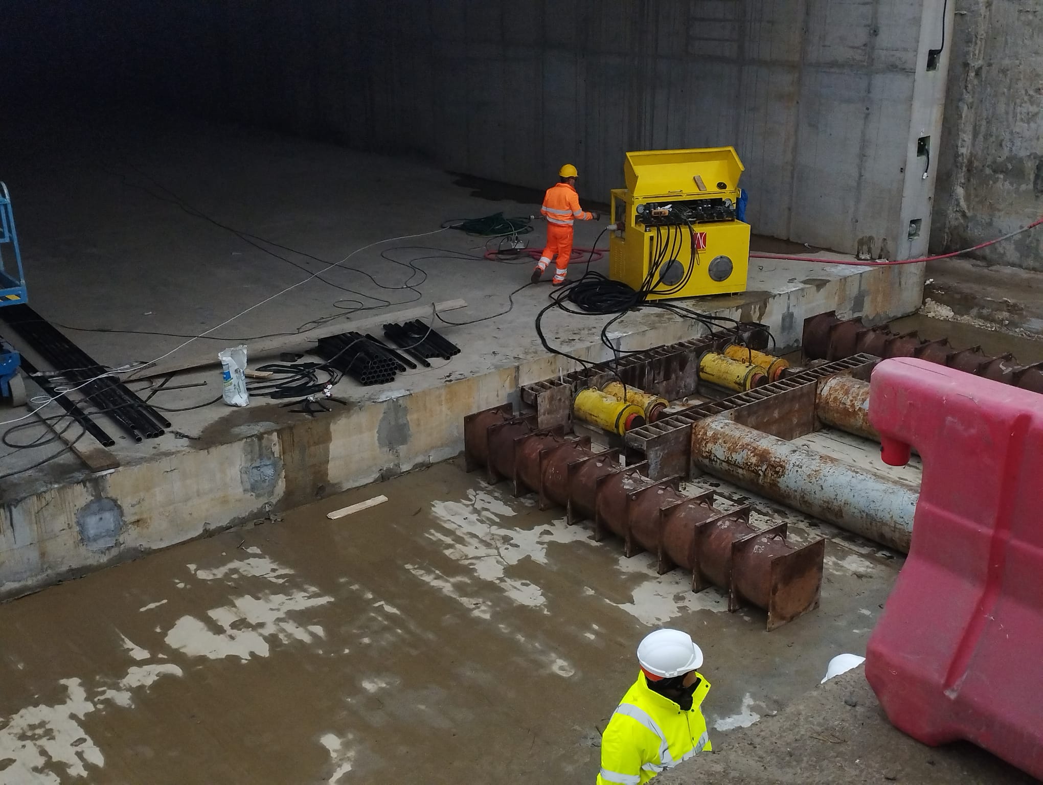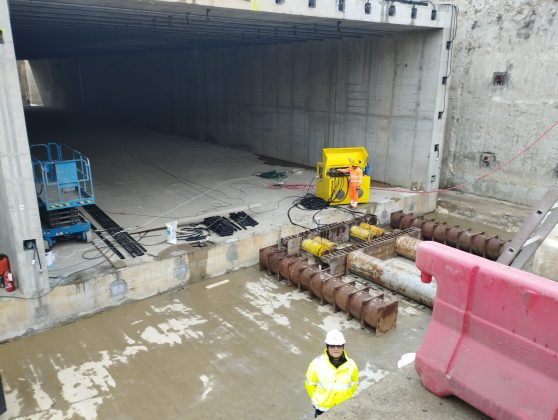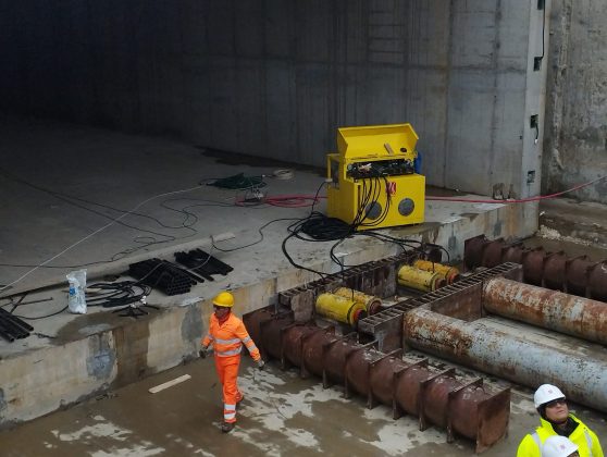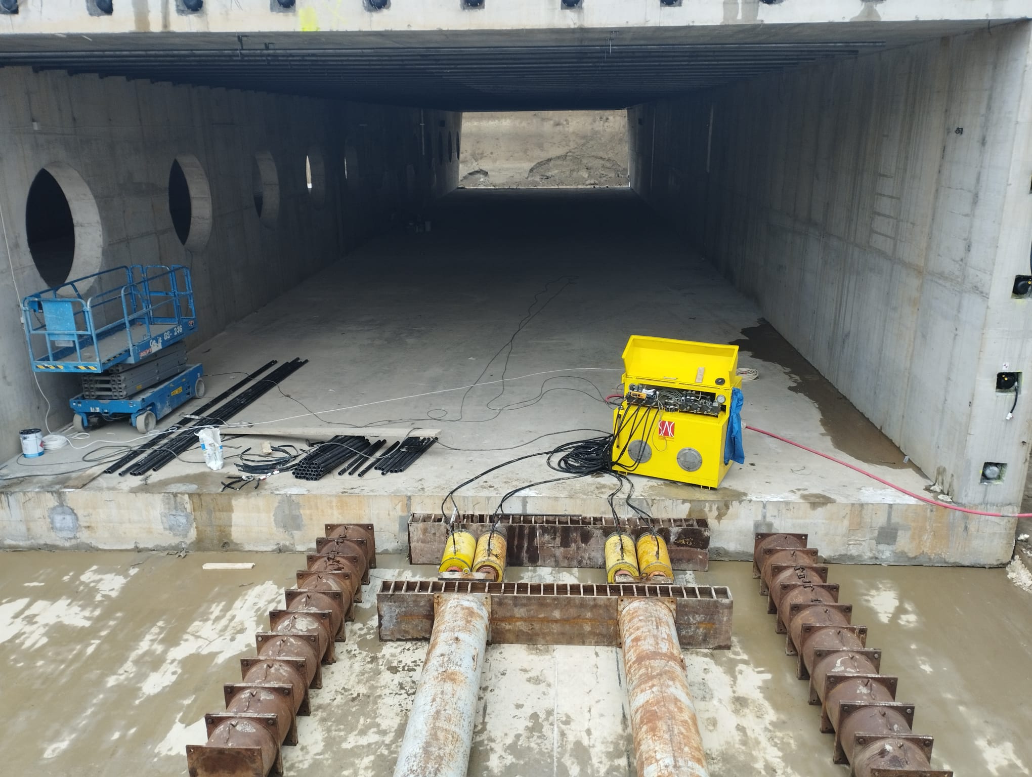 Cu ajutorul acestui mecanism uriașa structură din beton armat este împinsă prin vibrații fine sub bucata din pământ care are deasupra liniile de cale ferată.