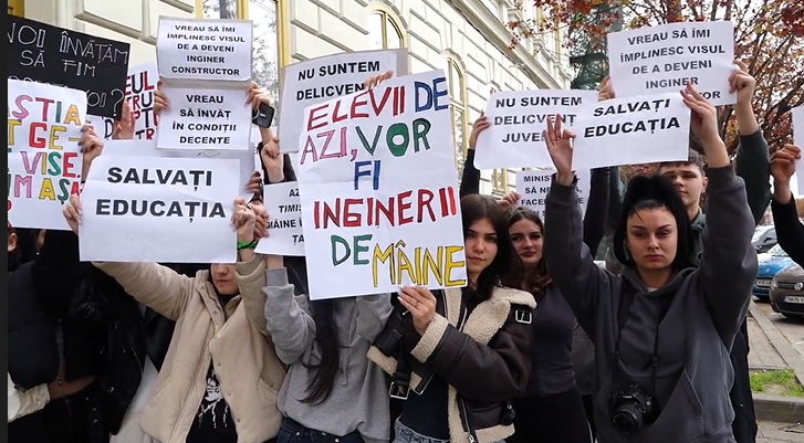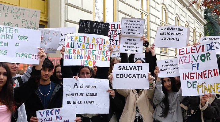 Elevii Liceului Tehnologic Vest au protestat împotriva deciziei Primăriei Timișoara de a-i muta din clădirea liceului lor. Elevii au protestat în fața instituției, în curte, dar și în Sala de Sport împotriva posibilității de relocare a lor, anunțată public de Primărie vineri.
