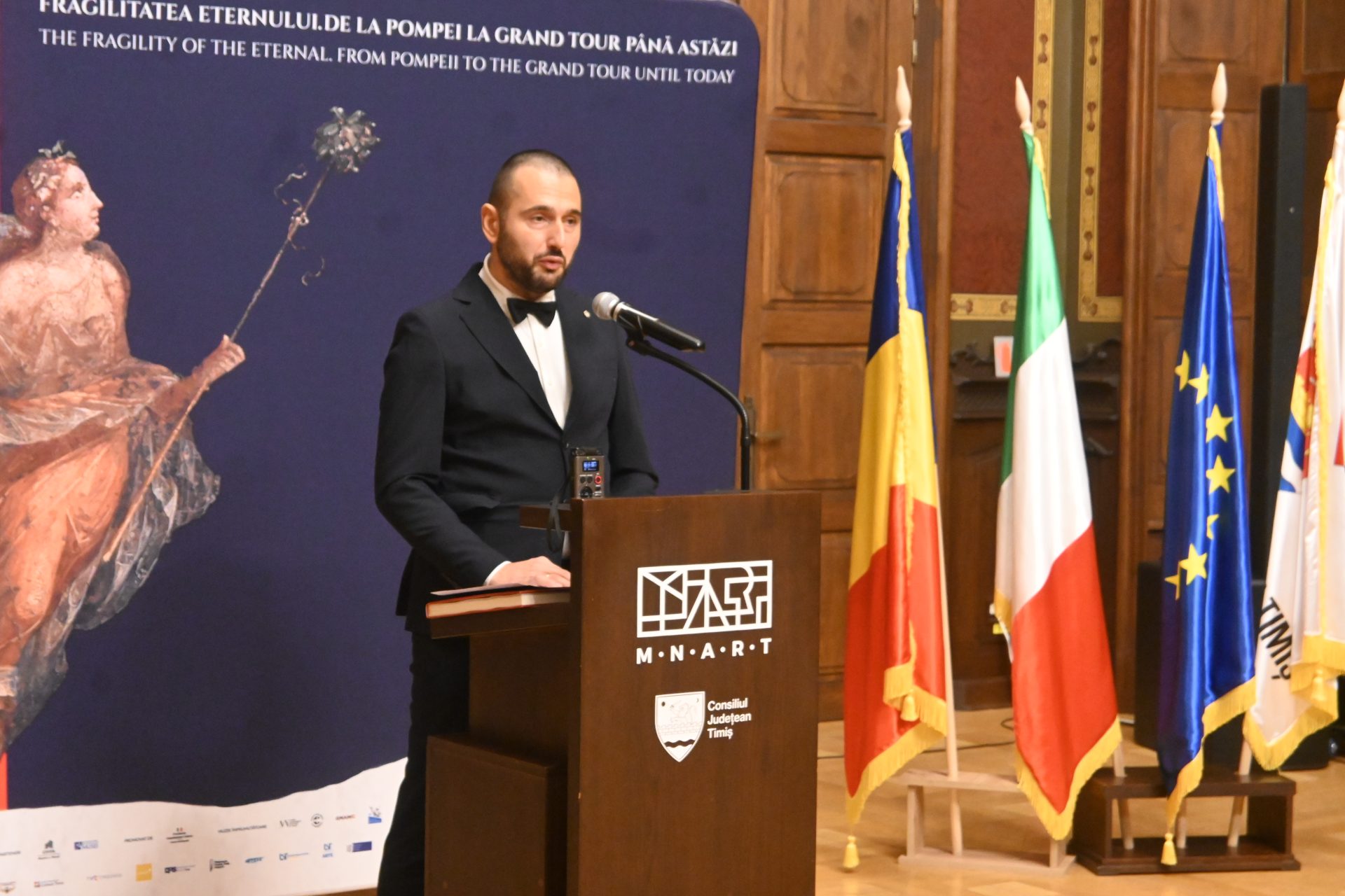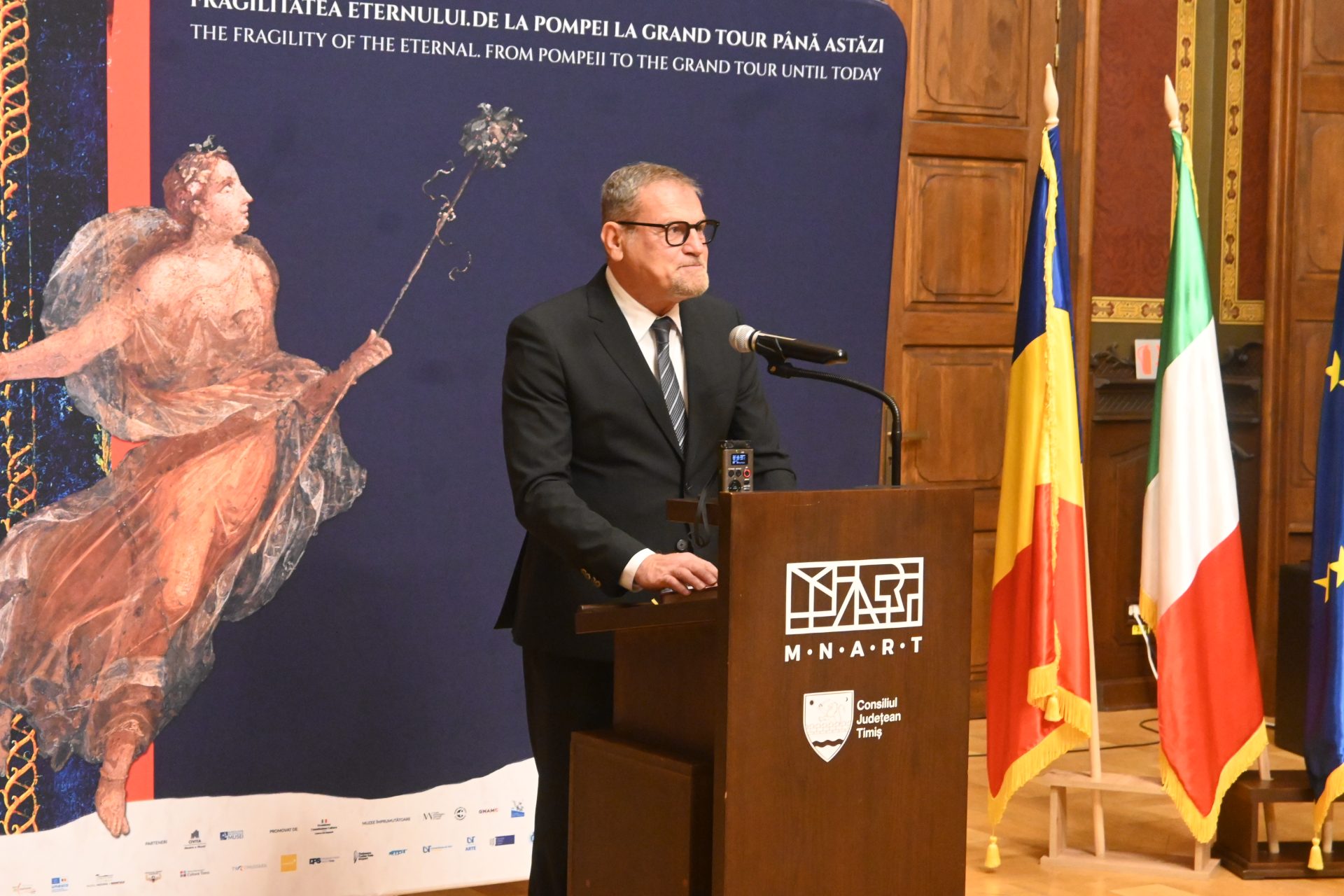 „Promovarea expoziției „Fragilitatea Eternului” la Timișoara este cea mai înaltă afirmare a legăturii istorice și culturale dintre Italia și România. În această împletire de mituri, amintiri și artă, expoziția de la Timișoara devine nu doar un eveniment expozițional, ci un act de recitire comună a rădăcinilor noastre, de la Vezuviu la Carpați, de la Mediterana la Carpați. Acest parcurs extraordinar, care unește ruinele de la Pompei cu pământul Daciei, demonstrează cum arta este cea mai puternică punte a noastră de memorie comună și se configurează ca un preludiu ideal și prestigios pentru Anul Cultural Romania – Italia 2026” declară Federico Mollicone, președintele Comisiei de Cultură, Știință și Educație a Camerei Deputaților – Parlamentul Republicii Italiene.