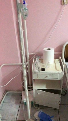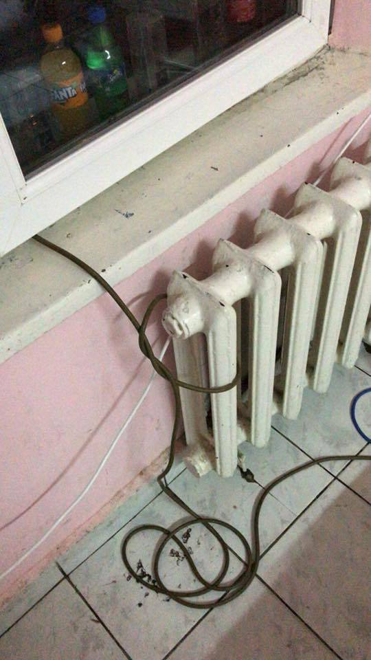 În pozele ataşate postării, apare, pe lângă imagini dezolante din camera de spital, un furtun subţine introdus pe geam în salon.