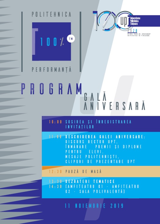 Centrul de Conferințe al Universității Politehnica Timișoara va găzdui, în 11 noiembrie 2019, începând cu ora 11:00, Gala aniversară „Politehnica™ 100% performanță” (100 de politehniști de succes pentru 100 de liceeni merituoși), un proiect demarat încă din primăvara acestui an, care acum a ajuns la punctul culminant.