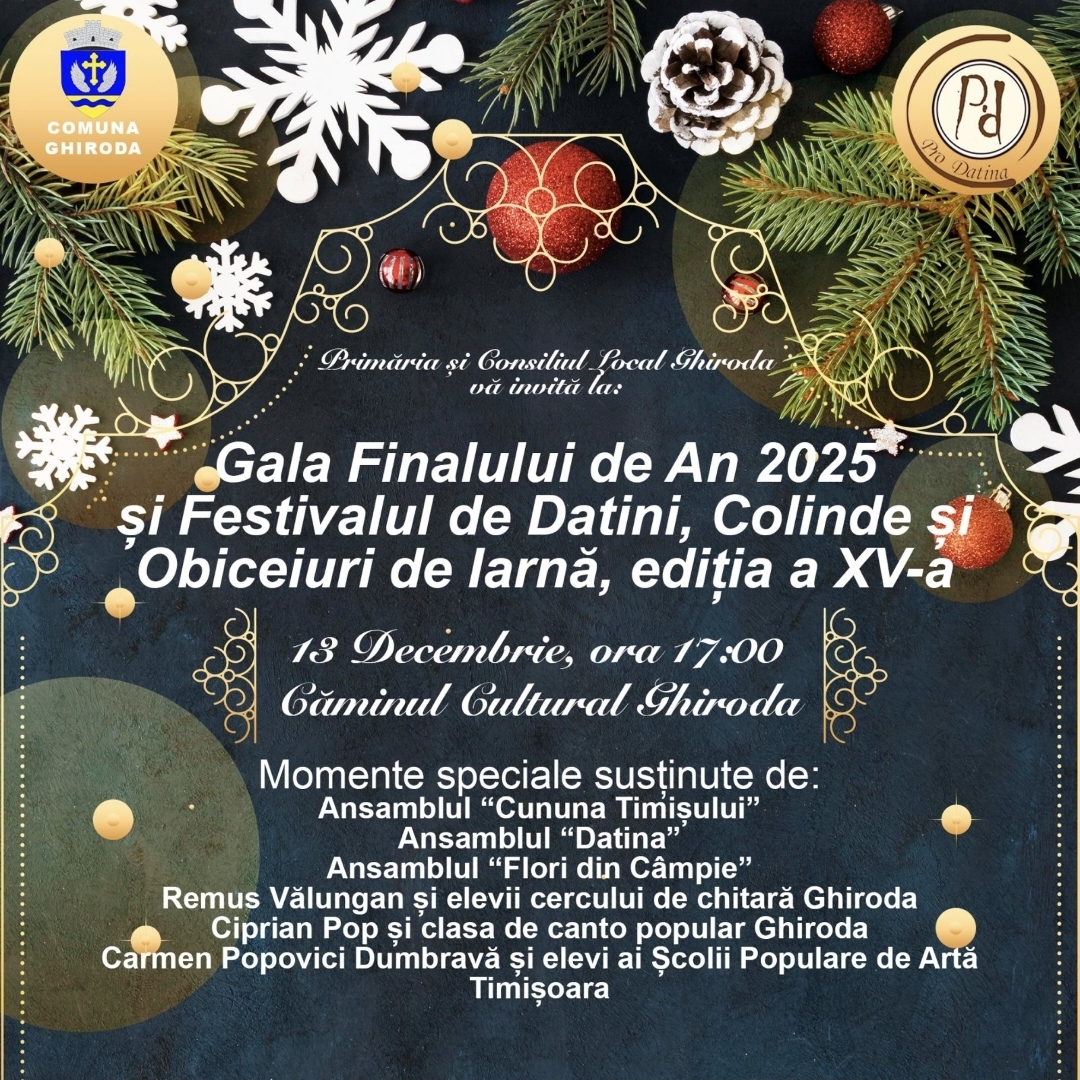 Primăria și Consiliul Local Ghiroda, în parteneriat cu Asociația ProDatina, organizează sâmbătă, 13 decembrie 2025, începând cu ora 17:00, la Căminul Cultural din Ghiroda, unul dintre cele mai îndrăgite evenimente ale sezonului: Gala Finalului de An și Festivalul de Datini, Colinde și Obiceiuri de Iarnă, ajuns la cea de-a XV-a ediție.