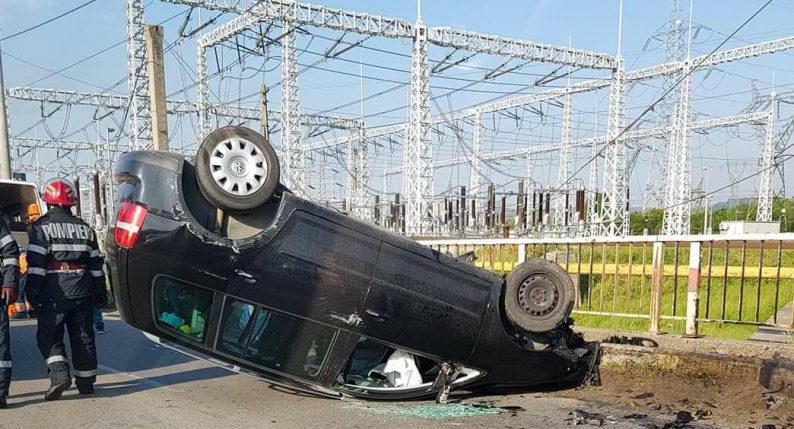 În urma impactului, autoturismul s-a răsturnat pe carosabil.