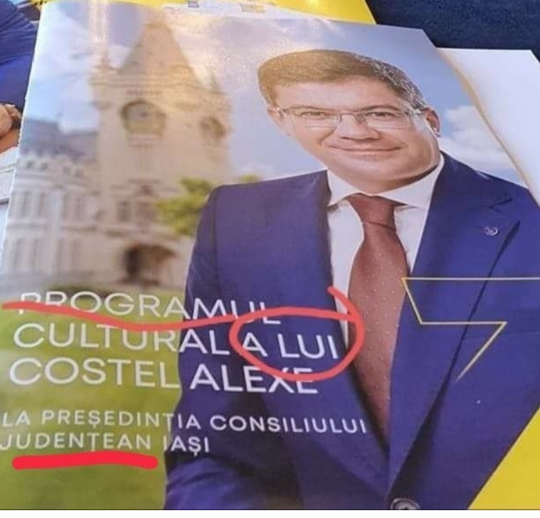 Coperta unui pliant care conține „programul cultural” prezentat de candidatul PNL pentru președinția Consiliului Județean Iași, Costel Alexe, conține o gravă greșeală de gramatică și una de scriere.