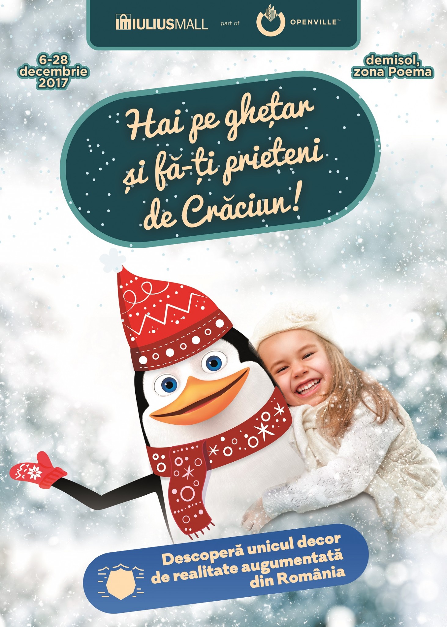 Pe lângă decorul de poveste din mall, un alt punct de atracție pentru clienți, mai ales pentru copii, este ghețarul de la demisol, zona Poema. Cei care vor să descopere ținutul înghețat trebuie să vină pe ghețar și, cu ajutorul realității augmentate, pe un ecran gigant, de 4,5 metri lățime și 3 metri înălțime, vor vedea cum li se alătură pinguini hazlii, foci jucăușe și un urs polar prietenos. Amicii virtuali sunt puși pe șotii, fac giumbușlucuri și se joacă, spre amuzamentul vizitatorilor. La final, clienții rămân cu o amintire din ținutul îndepărtat. Fotografiile sunt încărcate pe pagina de Facebook Iulius Mall Timişoara.