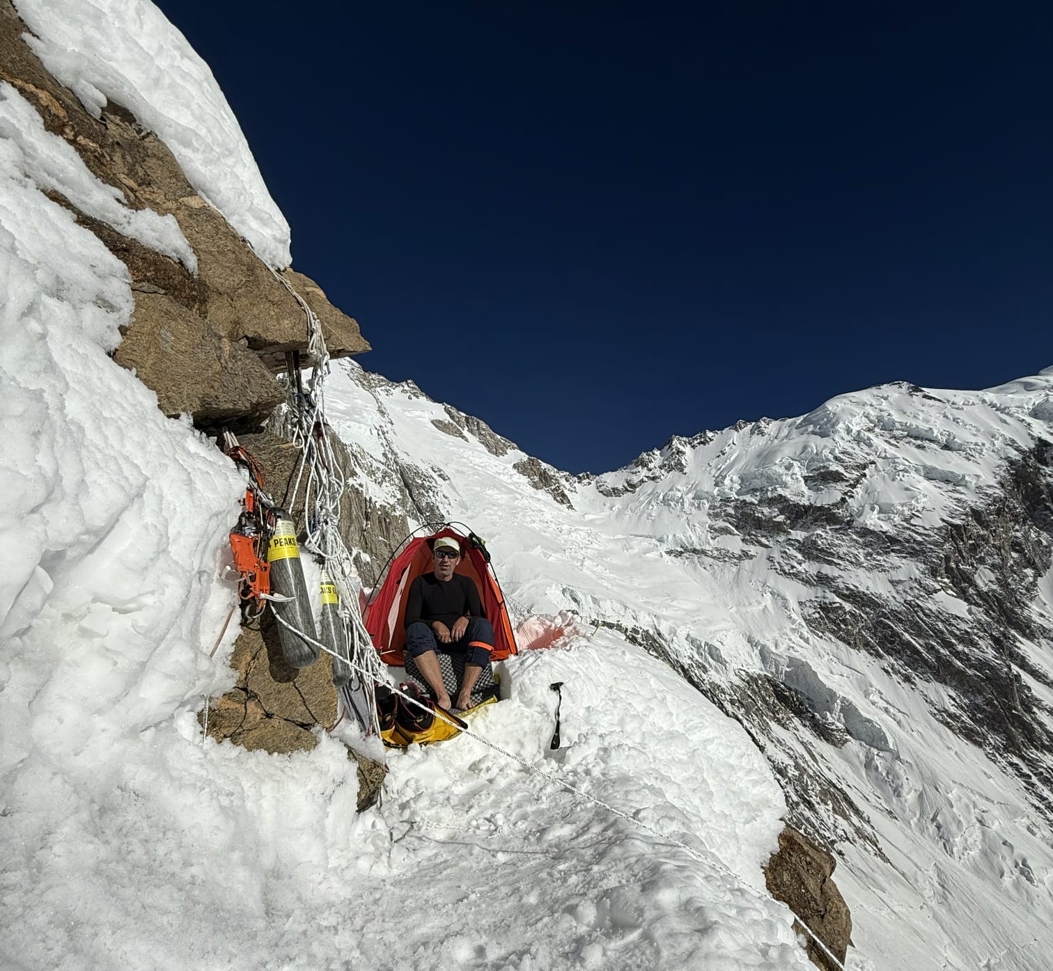 „A fost destul de solicitant să ajungem aici. Am urcat, câteva ore bune, 1.800 de metri cu toate bagajele în spate. Iar ultimii 150 de metri au fost un perete care ne-a cocoșat. O provocare a fost și să găsesc un loc pentru cort. L-am pus pe o platformă de 2 pe 1 metru, deasupra unui hău, legat în corzile fixe. Stătea strâmb pentru că într-o parte era gheață și nu am reușit să o nivelez”, a spus Horia Colibășanu, într-un mesaj transmis prin telefonul satelit.