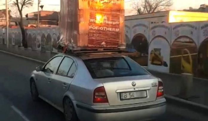 O filmare care arată o mașină transportând un europalet cu cărămidă prins în chingi pe un portbagaj improvizat pe plafonul autovehiculului a devenit virală pe Facebook. ”Bă, ești nebun la cap?! Ca-n India! La prima frână îi cade ăla de acolo”, comentează cei care au filmat scena pe una din străzile din București.