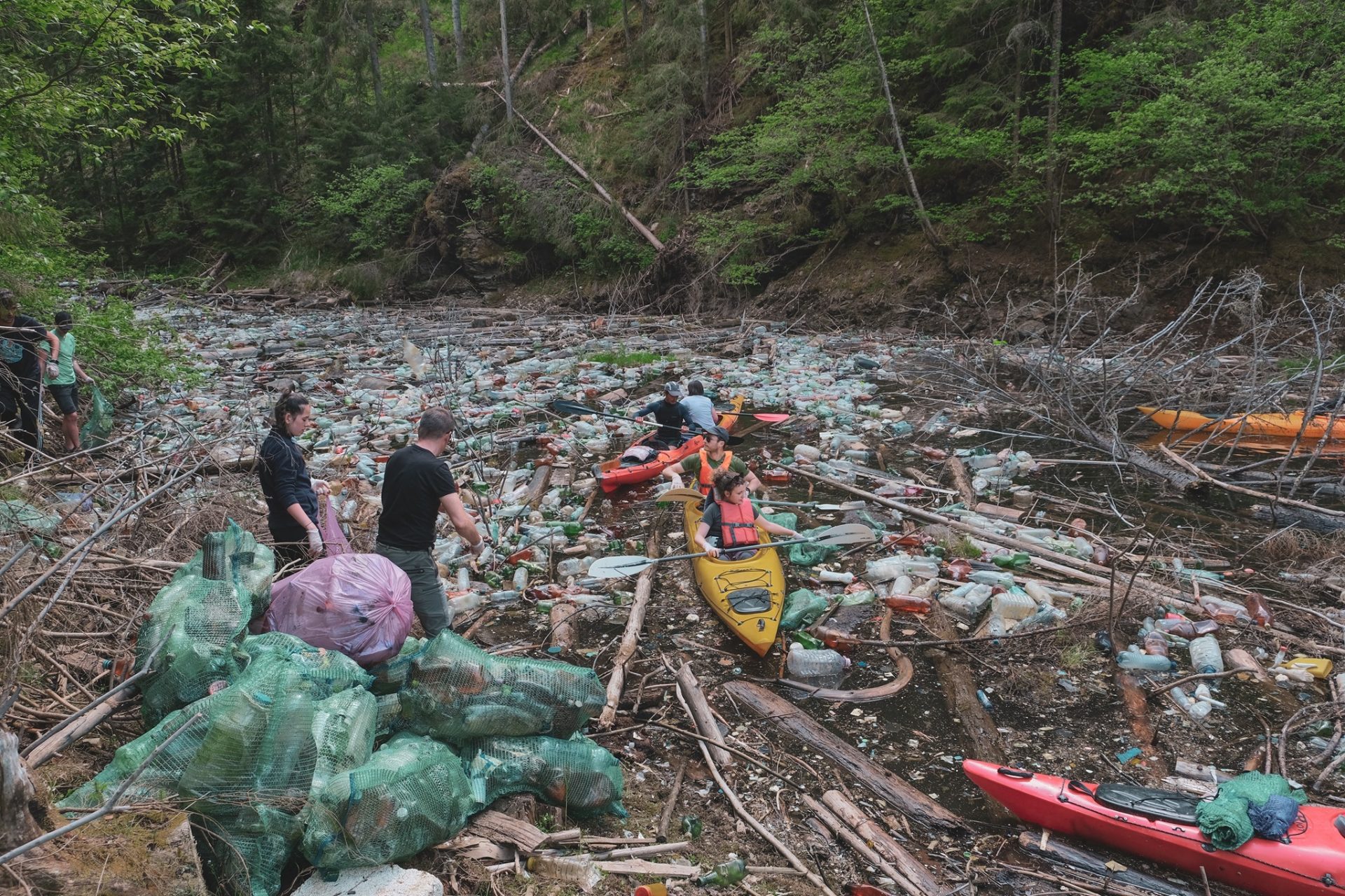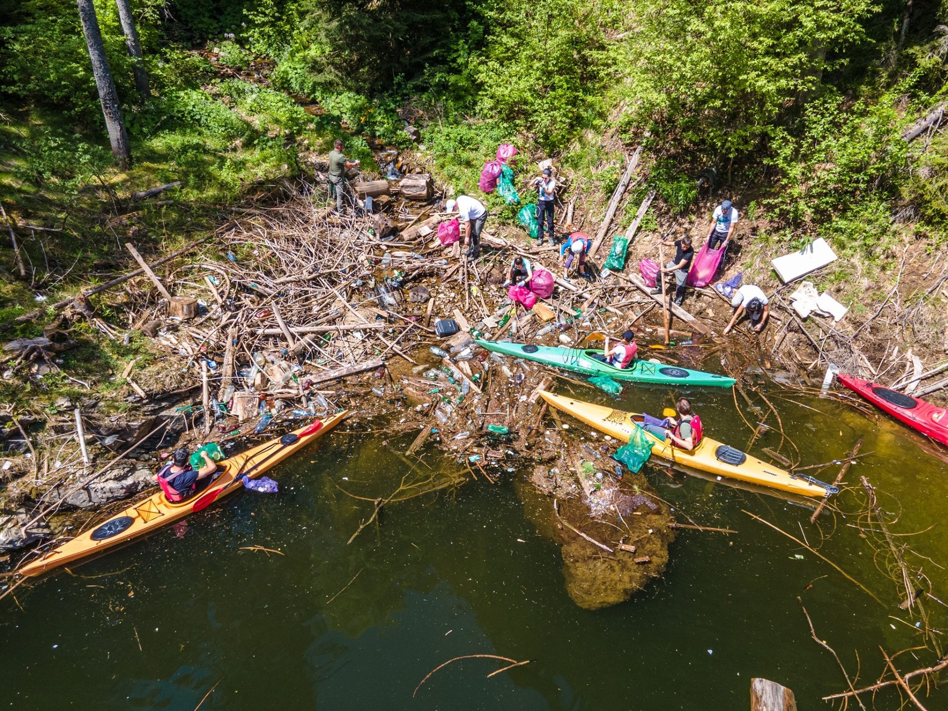 În acțiunea care a avut loc în weekendul 4-6 iunie s-au implicat 120 de voluntari de la Clubul Alpin Roman Filiala Cluj și Master Adventure, a informat marți Romsilva, care a făcut publice pe pagina de Facebook imagini incredibile cu PET-urile care au acoperit luciul de apă și s-au adunat în locurile greu accesibile. S-a putut interveni numai cu barca, dar s-a reușit adunarea unei cantități mari de deșeuri.