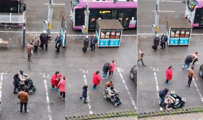 Pe imagini se poate vedea cum o femeie, care pare însoţitoarea victimei, se ceartă cu o alt[ doamnă însoţită de mai multe persoane. Lucrurile se precipită şi aceasta din urmă atacă folosind o umbrelă. În conflict intervine şi femeia aflat în scaunul cu rotile şi intră cu roata din faţă în doamna cu umbrela.