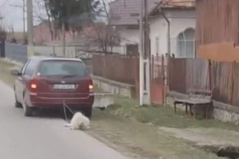 În filmuleţ se vede cum un câine e legat cu o sfoară de gât şi agăţat de un autoturism. Maşina e condusă pe acostamentul şoselei, cu avariile pornite, cu viteză redusă.