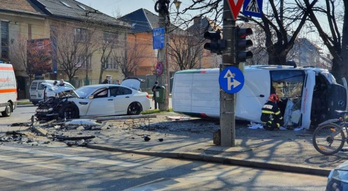 Accident spectaculos la intersecţia străzii Cluj cu Eroilor, acolo unde o autoutilitară a fost proiectată în gardul unei case din zonă, după ce a fost izbiză puternic de un autoturism marca BWM.