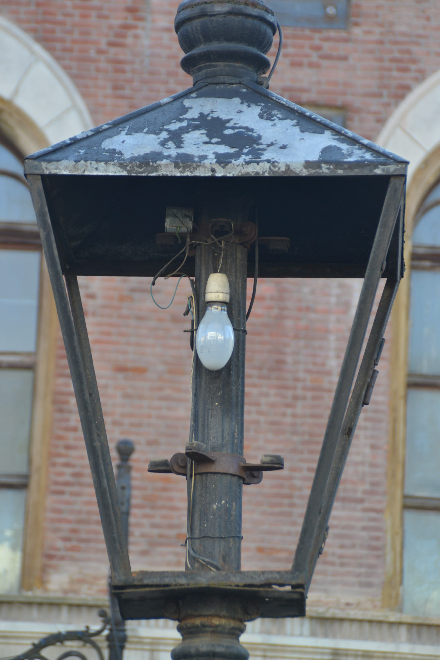 Până destul de recent, chiar se puteau citi câteva date istorice despre iluminatul electric. Plăcile de sticlă au fost sparte, becurile atârnă de câte un fir sfrijit. Unul din stâlpi a fost distrus de un bezmetic ce s-a cocoțat în vârf acum două ediții în urmă al celebrului „târg de Crăciun” pentru a se lega la curent. De fapt s-a urcat să fure curent! Sigur că metalul vechi și ruginit nu a rezistat la greutatea imbecilului și a cedat. Stâlpul s-a rupt din treimea superioară. Bucata distrusă a stat pe la muzeu o vreme până a fost luată și de acolo. Pentru cineva obișnuit cu ordinea și curățenia este greu de înțeles de ce se află în acea stare ansamblul electric. Fire neizolate ce atârnă, becurile lipsă. Acel singur bec prăpădit ce mai există este imitație de corp de iluminat. Un banal bec economic făcut undeva prin Asia ce se aprinde când are chef.