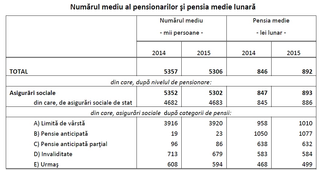 Pensia medie lunară a fost de 892 lei, mai mare cu 5,4% faţă de anul precedent, iar pensia medie de asigurări sociale de stat a fost de 886 lei,.
